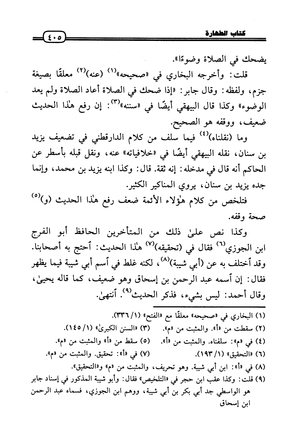 وَكَذَا نَص عَلَى ذَلِك من الْمُتَأَخِّرين الْحَافِظ أَبُو الْفرج بن الْجَوْزِيّ فَقَالَ فِي (تَحْقِيقه) هَذَا الحَدِيث: احْتج بِهِ أَصْحَابنَا. وَقد اخْتلف بِهِ عَن (أبي شيبَة) ، لكنه غلط فِي اسْم أبي شيبَة فِيمَا يظْهر فَقَالَ: إِن اسْمه عبد الرَّحْمَن بن إِسْحَاق وَهُوَ ضَعِيف، كَمَا قَالَه يَحْيَى، وَقَالَ أَحْمد: لَيْسَ بِشَيْء، فَذكر الحَدِيث. انْتَهَى.
