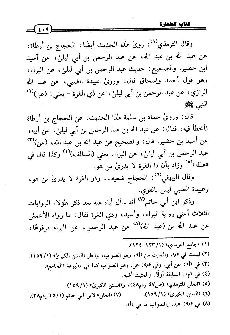 قَالَ: وَرَوَى حَمَّاد بن سَلمَة هَذَا الحَدِيث، عَن الْحجَّاج بن أَرْطَاة فَأَخْطَأَ فِيهِ، فَقَالَ: عَن عبد الله بن عبد الرَّحْمَن بن أبي لَيْلَى، عَن أَبِيه، عَن أسيد بن حضير. قَالَ: وَالصَّحِيح عَن عبد الله بن عبد الله، (عَن) عبد الرَّحْمَن بن أبي لَيْلَى، عَن الْبَراء. يَعْنِي (السالف) وَكَذَا قَالَ فِي «علله» وَزَاد بِأَن ذَا الْغرَّة لَا يُدْرَى من هُوَ.