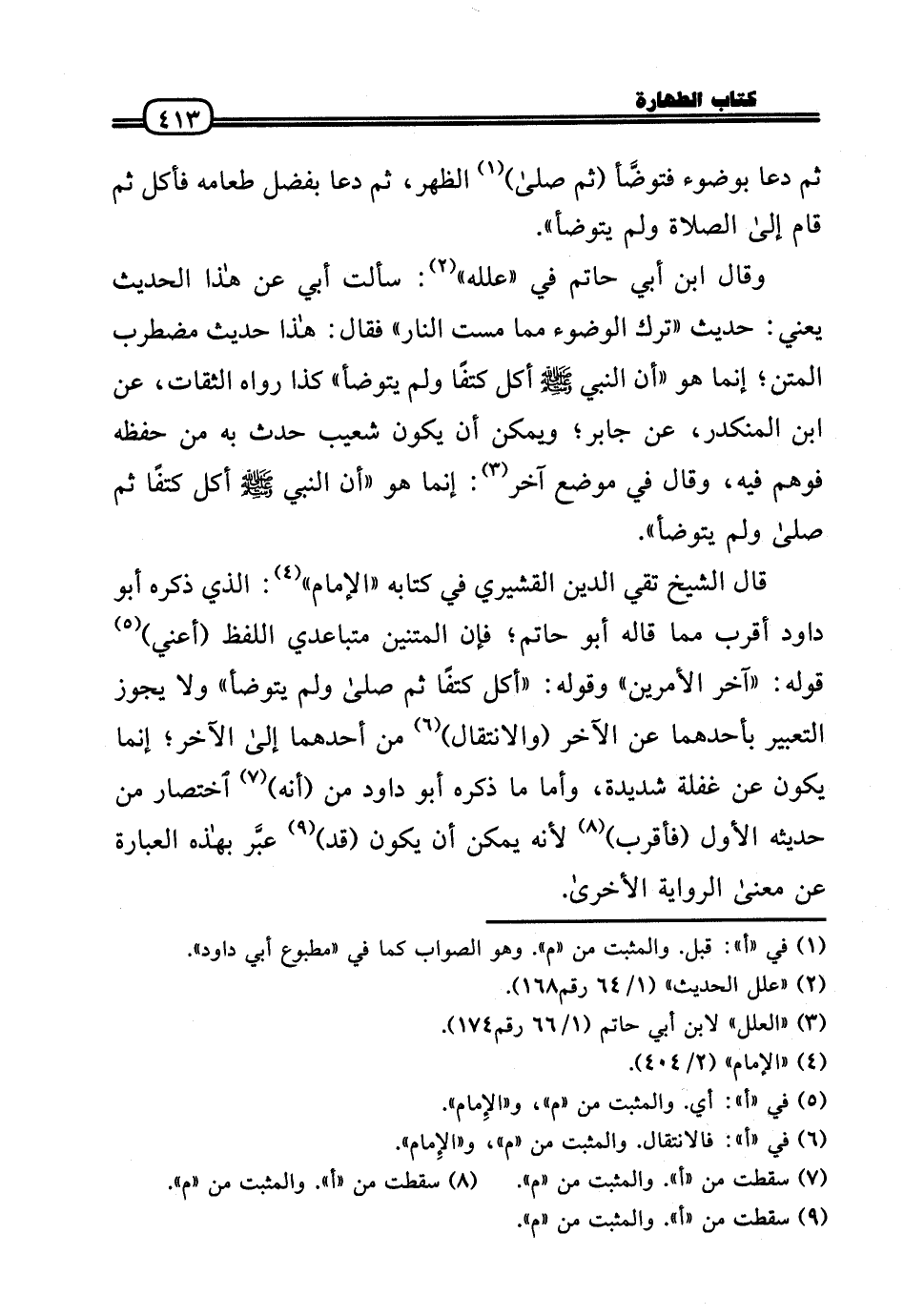 قَالَ الشَّيْخ تَقِيّ الدَّين الْقشيرِي فِي كِتَابه «الإِمَام» : الَّذِي ذكره أَبُو دَاوُد أقرب مِمَّا قَالَه أَبُو حَاتِم؛ فَإِن المتنين متباعدي اللَّفْظ (أَعنِي) قَوْله: «آخر الْأَمريْنِ» وَقَوله: «أكل كَتفًا ثمَّ صَلَّى وَلم يتَوَضَّأ» وَلَا يجوز التَّعْبِير بِأَحَدِهِمَا عَن الآخر (والانتقال) من أَحدهمَا إِلَى الآخر؛ إِنَّمَا يكون عَن غَفلَة شَدِيدَة، وَأما مَا ذكره أَبُو دَاوُد من (أَنه) اخْتِصَار من حَدِيثه الأول (فأقرب) لِأَنَّهُ يُمكن أَن يكون (قد) عبَّر بِهَذِهِ الْعبارَة عَن مَعْنَى الرِّوَايَة الْأُخْرَى.