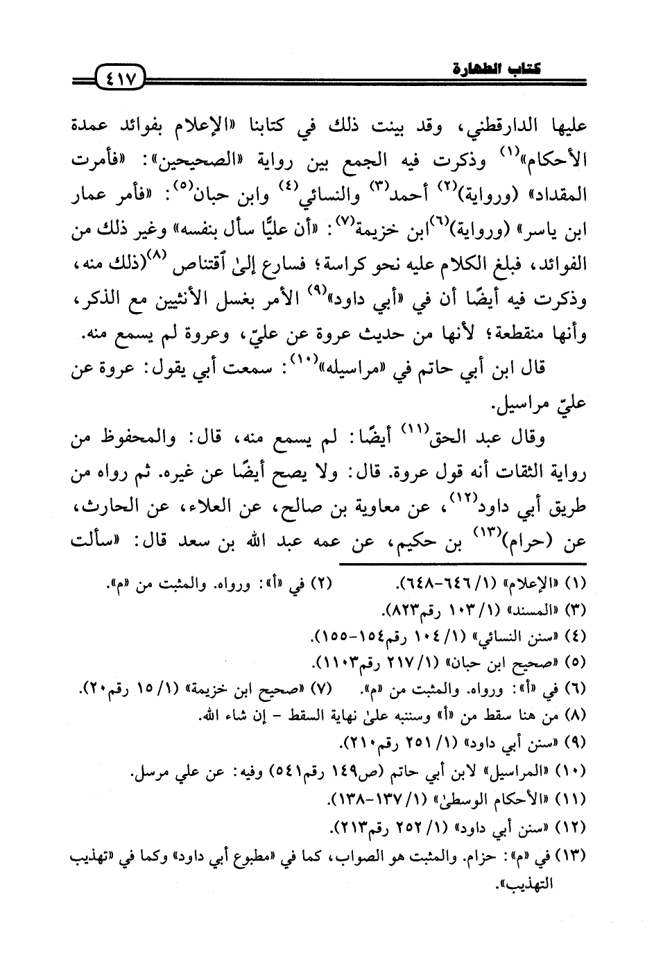 عَلَيْهَا الدَّارَقُطْنِيّ، وَقد بيّنت ذَلِك فِي كتَابنَا «الْإِعْلَام بفوائد عُمْدَة الْأَحْكَام» وَذكرت فِيهِ الْجمع بَين رِوَايَة «الصَّحِيحَيْنِ» : «فَأمرت الْمِقْدَاد» (وَرِوَايَة) أَحْمد وَالنَّسَائِيّ وَابْن حبَان: «فَأمر عمار بن يَاسر» (وَرِوَايَة) ابْن خُزَيْمَة: «أَن عليًّا سَأَلَ بِنَفسِهِ» وَغير ذَلِك من الْفَوَائِد، فَبلغ الْكَلَام عَلَيْهِ نَحْو كراسة؛ فسارع إِلَى اقتناص (ذَلِك مِنْهُ، وَذكرت فِيهِ أَيْضا أَن فِي «أبي دَاوُد» الْأَمر بِغسْل الْأُنْثَيَيْنِ مَعَ الذّكر، وَأَنَّهَا مُنْقَطِعَة؛ لِأَنَّهَا من حَدِيث عُرْوَة عَن عليّ، وَعُرْوَة لم يسمع مِنْهُ.