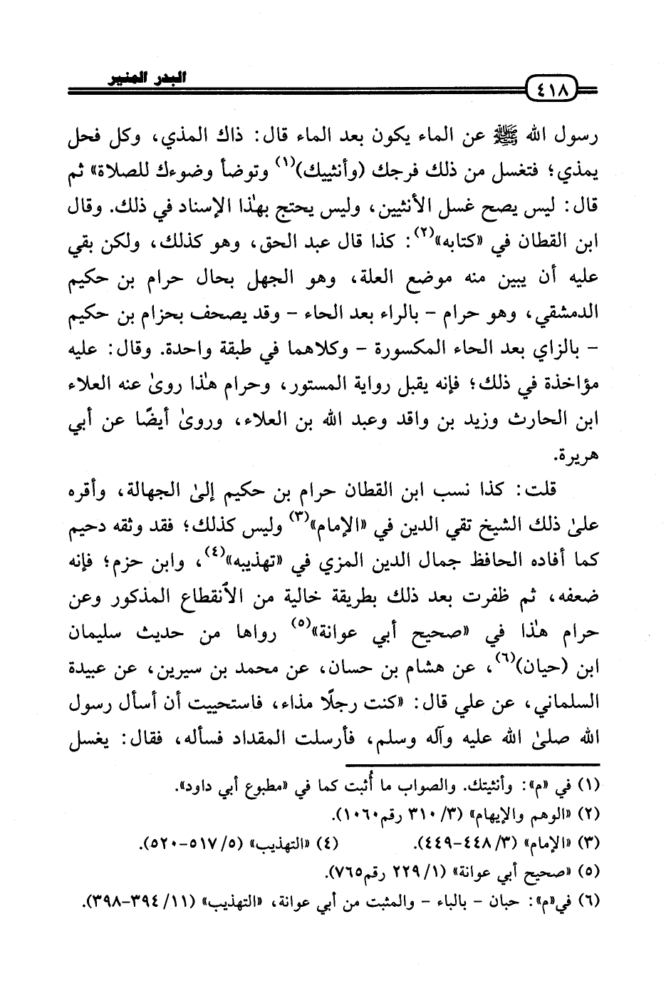 قلت: كَذَا نسب ابْن الْقطَّان حرَام بن حَكِيم إِلَى الْجَهَالَة، وَأقرهُ عَلَى ذَلِك الشَّيْخ تَقِيّ الدَّين فِي «الإِمَام» وَلَيْسَ كَذَلِك؛ فقد وَثَّقَهُ دُحَيْم كَمَا أَفَادَهُ الْحَافِظ جمال الدَّين الْمزي فِي «تهذيبه» ، وَابْن حزم؛ فَإِنَّهُ ضعفه، ثمَّ ظَفرت بعد ذَلِك بطريقة خَالِيَة من الِانْقِطَاع الْمَذْكُور وَعَن حرَام هَذَا فِي «صَحِيح أبي عوَانَة» رَوَاهَا من حَدِيث سُلَيْمَان بن (حَيَّان) ، عَن هِشَام بن حسان، عَن مُحَمَّد بن سِيرِين، عَن عُبَيْدَة السَّلمَانِي، عَن عَلّي قَالَ: «كنت رجلا مذاء، فَاسْتَحْيَيْت أَن أسأَل رَسُول الله صَلَّى الله عَلَيْهِ وَآله وَسلم، فَأرْسلت الْمِقْدَاد فَسَأَلَهُ، فَقَالَ: يغسل