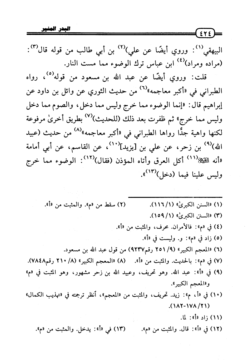 قلت: وَرُوِيَ أَيْضا عَن عبد الله بن مَسْعُود من قَوْله، رَوَاهُ الطَّبَرَانِيّ فِي «أكبر معاجمه» من حَدِيث الثَّوْريّ عَن وَائِل بن دَاوُد عَن إِبْرَاهِيم قَالَ: «إِنَّمَا الْوضُوء مِمَّا خرج وَلَيْسَ مِمَّا دخل، وَالصَّوْم مِمَّا دخل وَلَيْسَ مِمَّا خرج» ثمَّ ظَفرت بعد ذَلِك (للْحَدِيث) بطرِيق أُخْرَى مَرْفُوعَة لَكِنَّهَا واهية جدًّا رَوَاهَا الطَّبَرَانِيّ فِي «أكبر معاجمه» من حَدِيث (عبيد الله) بن زحر، عَن عَلّي بن [يزِيد] ، عَن الْقَاسِم، عَن أبي أُمَامَة «أَنه عَلَيْهِ السَّلَام أكل الْعرق وَأَتَاهُ الْمُؤَذّن (فَقَالَ) : الْوضُوء مِمَّا خرج وَلَيْسَ علينا فِيمَا (دخل) » .