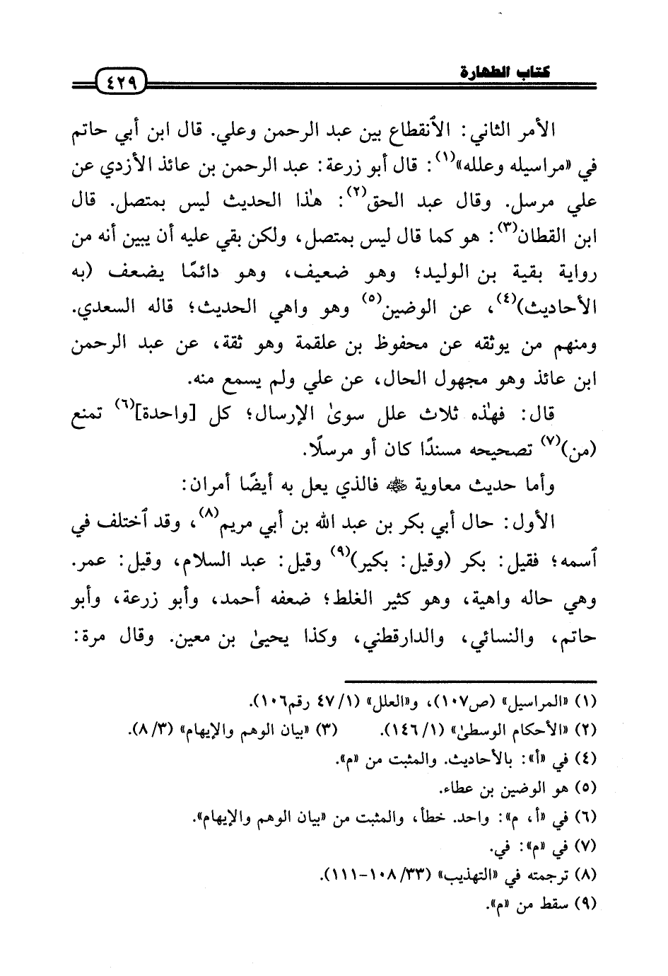 الْأَمر الثَّانِي: الِانْقِطَاع بَين عبد الرَّحْمَن وَعلي. قَالَ ابْن أبي حَاتِم فِي «مراسيله وَعلله» : قَالَ أَبُو زرْعَة: عبد الرَّحْمَن بن عَائِذ الْأَزْدِيّ عَن عَلّي مُرْسل. وَقَالَ عبد الْحق: هَذَا الحَدِيث لَيْسَ بِمُتَّصِل. قَالَ ابْن الْقطَّان: هُوَ كَمَا قَالَ لَيْسَ بِمُتَّصِل، وَلَكِن بَقِي عَلَيْهِ أَن يبين أَنه من رِوَايَة بَقِيَّة بن الْوَلِيد؛ وَهُوَ ضَعِيف، وَهُوَ دَائِما يضعف (بِهِ الْأَحَادِيث) ، عَن الْوَضِين وَهُوَ واهي الحَدِيث؛ قَالَه السَّعْدِيّ. وَمِنْهُم من يوثقه عَن مَحْفُوظ بن عَلْقَمَة وَهُوَ ثِقَة، عَن عبد الرَّحْمَن بن عَائِذ وَهُوَ مَجْهُول الْحَال، عَن عَلّي وَلم يسمع مِنْهُ.