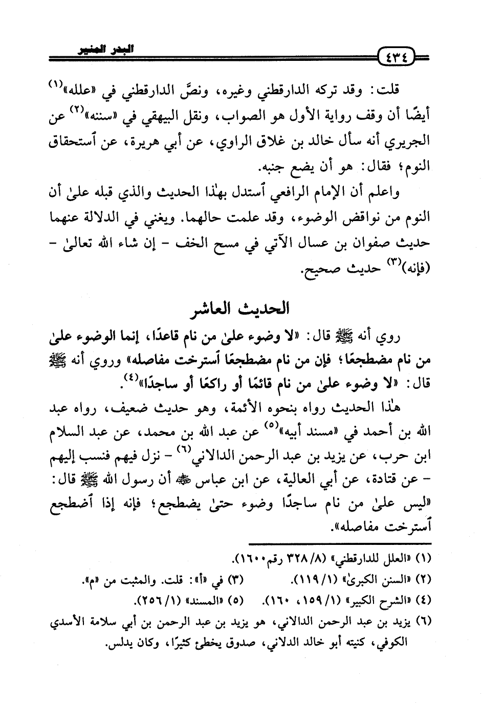 قلت: وَقد تَركه الدَّارَقُطْنِيّ وَغَيره، ونصَّ الدَّارَقُطْنِيّ فِي «علله» أَيْضا أَن وقف رِوَايَة الأول هُوَ الصَّوَاب، وَنقل الْبَيْهَقِيّ فِي «سنَنه» عَن الْجريرِي أَنه سَأَلَ خَالِد بن غلاق الرَّاوِي، عَن أبي هُرَيْرَة، عَن اسْتِحْقَاق النّوم؛ فَقَالَ: هُوَ أَن يضع جنبه.