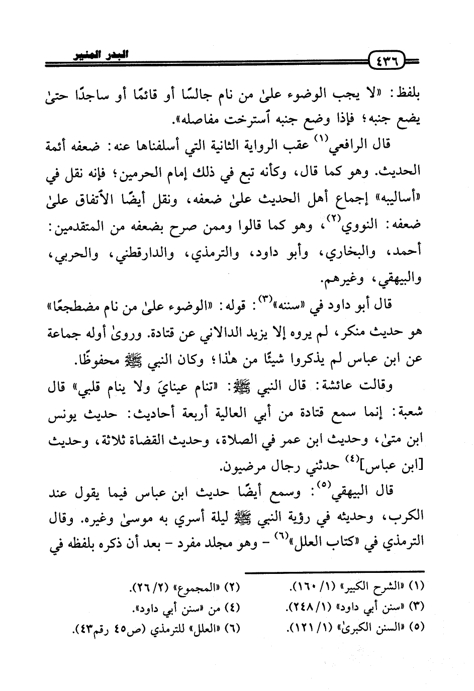 قَالَ أَبُو دَاوُد فِي «سنَنه» : قَوْله: «الْوضُوء عَلَى من نَام مُضْطَجعا» هُوَ حَدِيث مُنكر، لم يروه إِلَّا يزِيد الدالاني عَن قَتَادَة. وَرَوَى أَوله جمَاعَة عَن ابْن عَبَّاس لم يذكرُوا شَيْئا من هَذَا؛ وَكَانَ النَّبِي - صَلَّى الله عَلَيْهِ وَسلم - مَحْفُوظًا.