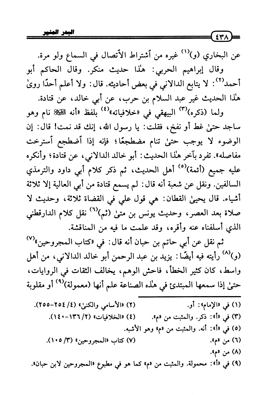 وَلما (ذكره) الْبَيْهَقِيّ فِي «خلافياته» بِلَفْظ «أَنه عَلَيْهِ السَّلَام نَام وَهُوَ ساجد حَتَّى غط أَو نفخ، فَقلت: يَا رَسُول الله، إِنَّك قد نمت! قَالَ: إِن الْوضُوء لَا يُوجب حَتَّى تنام مُضْطَجعا؛ فَإِنَّهُ إِذا اضْطجع استرخت مفاصله» . تفرد بآخر هَذَا الحَدِيث: أَبُو خَالِد الدالاني، عَن قَتَادَة؛ وَأنْكرهُ عَلَيْهِ جَمِيع (أَئِمَّة) أهل الحَدِيث، ثمَّ ذكر كَلَام أبي دَاوُد وَالتِّرْمِذِيّ السالفين. وَنقل عَن شُعْبَة أَنه قَالَ: لم يسمع قَتَادَة من أبي الْعَالِيَة إِلَّا ثَلَاثَة أَشْيَاء. قَالَ يَحْيَى الْقطَّان: هِيَ قَول عَلّي فِي الْقُضَاة ثَلَاثَة، وَحَدِيث لَا صَلَاة بعد الْعَصْر، وَحَدِيث يُونُس بن مَتى (ثمَّ) نقل كَلَام الدَّارَقُطْنِيّ الَّذِي أسلفناه عَنهُ وَأقرهُ، وَقد علمت مَا فِيهِ من المناقشة.