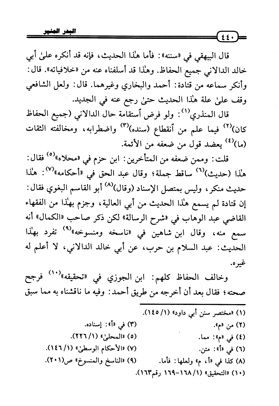 قلت: وَمِمَّنْ ضعفه من الْمُتَأَخِّرين: ابْن حزم فِي «محلاه» فَقَالَ: هَذَا (حَدِيث) سَاقِط جملَة؛ وَقَالَ عبد الْحق فِي «أَحْكَامه» : هَذَا حَدِيث مُنكر، وَلَيْسَ بِمُتَّصِل الْإِسْنَاد (وَقَالَ) أَبُو الْقَاسِم الْبَغَوِيّ فَقَالَ: إِن قَتَادَة لم يسمع هَذَا الحَدِيث من أبي الْعَالِيَة، وَجزم بِهَذَا من الْفُقَهَاء القَاضِي عبد الْوَهَّاب فِي «شرح الرسَالَة» لَكِن ذكر صَاحب «الْكَمَال» أَنه سمع مِنْهُ، وَقَالَ ابْن شاهين فِي «ناسخه ومنسوخه» تفرد بِهَذَا الحَدِيث: عبد السَّلَام بن حَرْب، عَن أبي خَالِد الدالاني، لَا أعلم لَهُ غَيره.