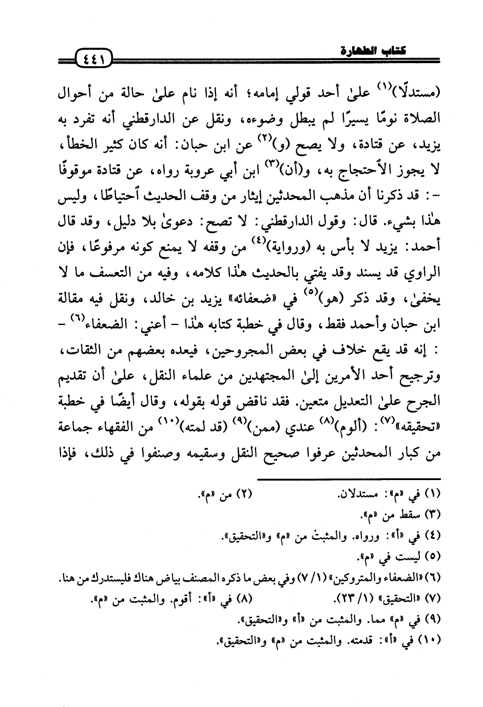 (مستدلاً) عَلَى أحد قولي إِمَامه؛ أَنه إِذا نَام عَلَى حَالَة من أَحْوَال الصَّلَاة نومًا يَسِيرا لم يبطل وضوءه، وَنقل عَن الدَّارَقُطْنِيّ أَنه تفرد بِهِ يزِيد، عَن قَتَادَة، وَلَا يَصح (و) عَن ابْن حبَان: أَنه كَانَ كثير الْخَطَأ، لَا يجوز الِاحْتِجَاج بِهِ، و (أَن) ابْن أبي عرُوبَة رَوَاهُ، عَن قَتَادَة مَوْقُوفا -: قد ذكرنَا أَن مَذْهَب الْمُحدثين إِيثَار من وقف الحَدِيث احْتِيَاطًا، وَلَيْسَ هَذَا بِشَيْء. قَالَ: وَقَول الدَّارَقُطْنِيّ: لَا تصح: دَعْوَى بِلَا دَلِيل، وَقد قَالَ أَحْمد: يزِيد لَا بَأْس بِهِ (وَرِوَايَة) من وَقفه لَا يمْنَع كَونه مَرْفُوعا، فَإِن الرَّاوِي قد يسند وَقد يُفْتِي بِالْحَدِيثِ هَذَا كَلَامه، وَفِيه من التعسف مَا لَا يخْفَى، وَقد ذكر (هُوَ) فِي «ضُعَفَائِهِ» يزِيد بن خَالِد، وَنقل فِيهِ مقَالَة ابْن حبَان وَأحمد فَقَط، وَقَالَ فِي خطْبَة كِتَابه هَذَا - أَعنِي: الضُّعَفَاء -: إِنَّه قد يَقع خلاف فِي بعض الْمَجْرُوحين، فيعده بَعضهم من الثِّقَات، وترجيح أحد الْأَمريْنِ إِلَى الْمُجْتَهدين من عُلَمَاء النَّقْل، عَلَى أَن تَقْدِيم الْجرْح عَلَى التَّعْدِيل مُتَعَيّن. فقد نَاقض قَوْله بقوله، وَقَالَ أَيْضا فِي خطْبَة «تَحْقِيقه» : (ألوم) عِنْدِي (مِمَّن) (قد لمته) من الْفُقَهَاء جمَاعَة من كبار الْمُحدثين عرفُوا صَحِيح النَّقْل وسقيمه وصنفوا فِي ذَلِك، فَإِذا