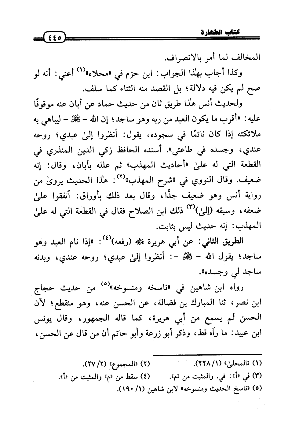 وَلِحَدِيث أنس هَذَا طَرِيق ثَان من حَدِيث حَمَّاد عَن أبان عَنهُ مَوْقُوفا عَلَيْهِ: «أقرب مَا يكون العَبْد من ربه وَهُوَ ساجد؛ إِن الله - عَزَّ وجَلَّ - ليباهي بِهِ مَلَائكَته إِذا كَانَ نَائِما فِي سُجُوده، يَقُول: انْظُرُوا إِلَى عَبدِي؛ روحه عِنْدِي، وَجَسَده فِي طَاعَتي» . أسْندهُ الْحَافِظ زكي الدَّين الْمُنْذِرِيّ فِي الْقطعَة الَّتِي لَهُ عَلَى «أَحَادِيث الْمُهَذّب» ثمَّ علله بِأَبَان، وَقَالَ: إِنَّه ضَعِيف. وَقَالَ النَّوَوِيّ فِي «شرح الْمُهَذّب» : هَذَا الحَدِيث يرْوَى من رِوَايَة أنس وَهُوَ ضَعِيف جدًّا، وَقَالَ بعد ذَلِك بأوراق: اتَّفقُوا عَلَى ضعفه، وَسَبقه (إِلَى) ذَلِك ابْن الصّلاح فَقَالَ فِي الْقطعَة الَّتِي لَهُ عَلَى الْمُهَذّب: إِنَّه حَدِيث لَيْسَ بِثَابِت.