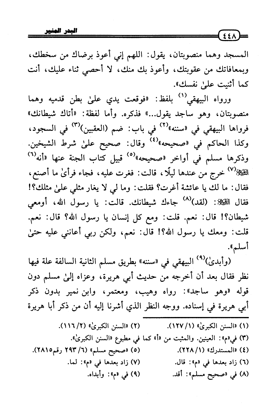 وَرَوَاهُ الْبَيْهَقِيّ بِلَفْظ: «فَوَقَعت يَدي عَلَى بطن قَدَمَيْهِ وهما منصوبتان، وَهُوَ ساجد يَقُول ... » فَذكره. وَأما لَفْظَة: «أَتَاك شَيْطَانك» فرواها الْبَيْهَقِيّ فِي «سنَنه» فِي بَاب: ضم (العقبين) فِي السُّجُود، وَكَذَا الْحَاكِم فِي «صَحِيحه» وَقَالَ: صَحِيح عَلَى شَرط الشَّيْخَيْنِ. وَذكرهَا مُسلم فِي أَوَاخِر «صَحِيحه» قبيل كتاب الْجنَّة عَنْهَا «أَنه عَلَيْهِ السَّلَام خرج من عِنْدهَا لَيْلًا، قَالَت: فغرت عَلَيْهِ، فجَاء فَرَأَى مَا أصنع، فَقَالَ: مَا لَك يَا عَائِشَة أغرت؟ فَقلت: وَمَا لي لَا يغار مثلي عَلَى مثلك؟ ! فَقَالَ عَلَيْهِ السَّلَام: (لقد) جَاءَك شَيْطَانك. قَالَت: يَا رَسُول الله، أومعي شَيْطَان؟ ! قَالَ: نعم. قلت: وَمَعَ كل إِنْسَان يَا رَسُول الله؟ قَالَ: نعم. قلت: ومعك يَا رَسُول الله؟ ! قَالَ: نعم، وَلَكِن رَبِّي أعانني عَلَيْهِ حَتَّى أسلم» .