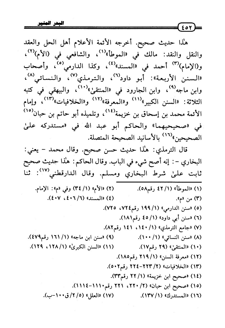 هَذَا حَدِيث صَحِيح. أخرجه الْأَئِمَّة الْأَعْلَام أهل الْحل وَالْعقد وَالنَّقْل والنقد: مَالك فِي «الْمُوَطَّأ» ، وَالشَّافِعِيّ فِي (الْأُم) ، و (الإِمَام) أَحْمد فِي «الْمسند» ، وَكَذَا الدَّارمِيّ، وَأَصْحَاب «السّنَن الْأَرْبَعَة» : أَبُو دَاوُد، وَالتِّرْمِذِيّ، وَالنَّسَائِيّ، وَابْن مَاجَه، وَابْن الْجَارُود فِي «الْمُنْتَقَى» ، وَالْبَيْهَقِيّ فِي كتبه الثَّلَاثَة: «السّنَن الْكَبِير» و «الْمعرفَة» و «الخلافيات» ، وَإِمَام الْأَئِمَّة مُحَمَّد بن إِسْحَاق بن خُزَيْمَة، وتلميذه أَبُو حَاتِم بن حبَان فِي «صَحِيحَيْهِمَا» وَالْحَاكِم أَبُو عبد الله فِي «مُسْتَدْركه عَلَى الصَّحِيحَيْنِ» بِالْأَسَانِيدِ الصَّحِيحَة الْمُتَّصِلَة.