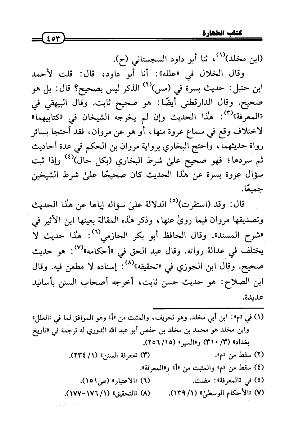 وَقَالَ الْخلال فِي «علله» : أَنا أَبُو دَاوُد، قَالَ: قلت لِأَحْمَد بن حَنْبَل: حَدِيث بسرة فِي (مس) الذّكر لَيْسَ بِصَحِيح؟ قَالَ: بل هُوَ صَحِيح. وَقَالَ الدَّارَقُطْنِيّ أَيْضا: هُوَ صَحِيح ثَابت. وَقَالَ الْبَيْهَقِيّ فِي «الْمعرفَة» : هَذَا الحَدِيث وَإِن لم يُخرجهُ الشَّيْخَانِ فِي «كِتَابَيْهِمَا» لاخْتِلَاف وَقع فِي سَماع عُرْوَة مِنْهَا، أَو هُوَ عَن مَرْوَان، فقد احتجا بِسَائِر رُوَاة حَدِيثهمَا، وَاحْتج البُخَارِيّ بِرِوَايَة مَرْوَان بن الحكم فِي عدَّة أَحَادِيث ثمَّ سردها؛ فَهُوَ صَحِيح عَلَى شَرط البُخَارِيّ (بِكُل حَال) وَإِذا ثَبت سُؤال عُرْوَة بسرة عَن هَذَا الحَدِيث كَانَ صَحِيحا عَلَى شَرط الشَّيْخَيْنِ جَمِيعًا.