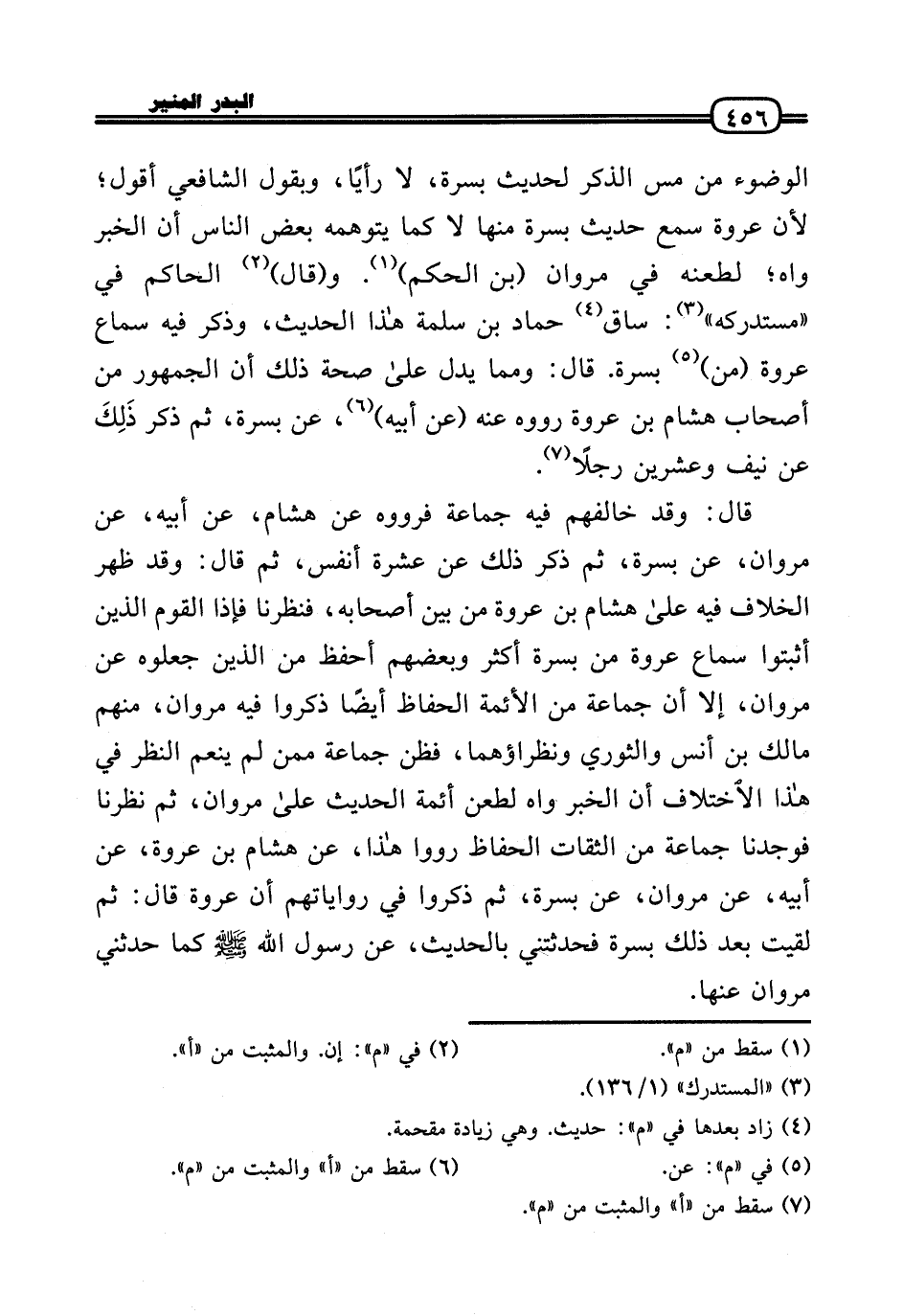 قَالَ: وَقد خالفهم فِيهِ جمَاعَة فَرَوَوْه عَن هِشَام، عَن أَبِيه، عَن مَرْوَان، عَن بسرة، ثمَّ ذكر ذَلِك عَن عشرَة أنفس، ثمَّ قَالَ: وَقد ظهر الْخلاف فِيهِ عَلَى هِشَام بن عُرْوَة من بَين أَصْحَابه، فَنَظَرْنَا فَإِذا الْقَوْم الَّذين أثبتوا سَماع عُرْوَة من بسرة أَكثر وَبَعْضهمْ أحفظ من الَّذين جَعَلُوهُ عَن مَرْوَان، إِلَّا أَن جمَاعَة من الْأَئِمَّة الْحفاظ أَيْضا ذكرُوا فِيهِ مَرْوَان، مِنْهُم مَالك بن أنس وَالثَّوْري ونظراؤهما، فَظن جمَاعَة مِمَّن لم ينعم النّظر فِي هَذَا الِاخْتِلَاف أَن الْخَبَر واه لطعن أَئِمَّة الحَدِيث عَلَى مَرْوَان، ثمَّ نَظرنَا فَوَجَدنَا جمَاعَة من الثِّقَات الْحفاظ رووا هَذَا، عَن هِشَام بن عُرْوَة، عَن أَبِيه، عَن مَرْوَان، عَن بسرة، ثمَّ ذكرُوا فِي رواياتهم أَن عُرْوَة قَالَ: ثمَّ لقِيت بعد ذَلِك بسرة فحدثتني بِالْحَدِيثِ، عَن رَسُول الله - صَلَّى الله عَلَيْهِ وَسلم - كَمَا حَدثنِي مَرْوَان عَنْهَا.