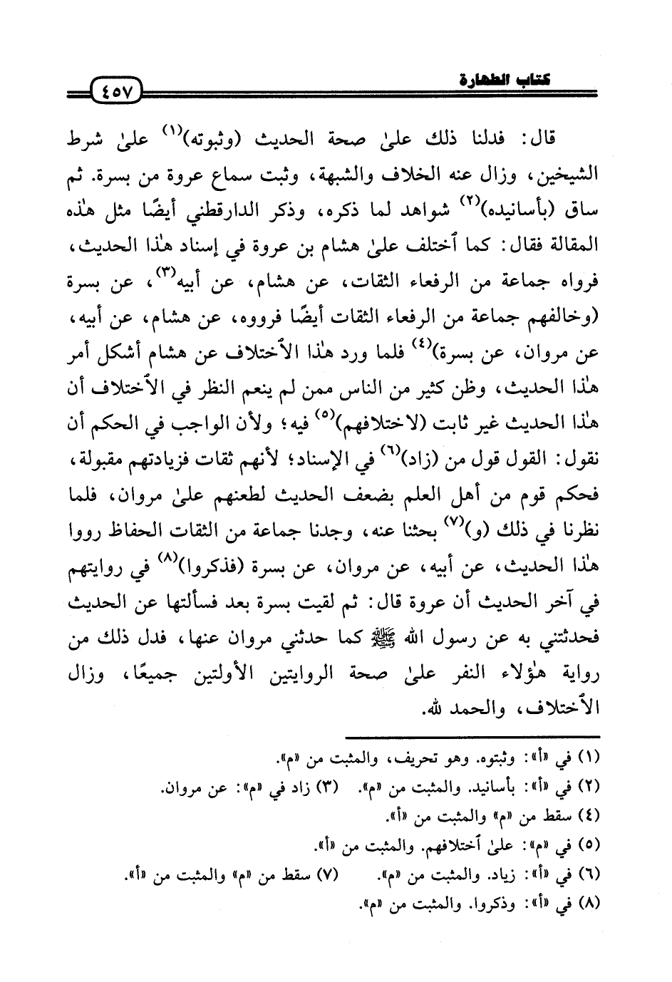 قَالَ: فدلنا ذَلِك عَلَى صِحَة الحَدِيث (وثبوته) عَلَى شَرط الشَّيْخَيْنِ، وَزَالَ عَنهُ الْخلاف والشبهة، وَثَبت سَماع عُرْوَة من بسرة. ثمَّ سَاق (بأسانيده) شَوَاهِد لما ذكره، وَذكر الدَّارَقُطْنِيّ أَيْضا مثل هَذِه الْمقَالة فَقَالَ: كَمَا اخْتلف عَلَى هِشَام بن عُرْوَة فِي إِسْنَاد هَذَا الحَدِيث، فَرَوَاهُ جمَاعَة من الرفعاء الثِّقَات، عَن هِشَام، عَن أَبِيه، عَن بسرة (وَخَالفهُم جمَاعَة من الرفعاء الثِّقَات أَيْضا فَرَوَوْه، عَن هِشَام، عَن أَبِيه، عَن مَرْوَان، عَن بسرة) فَلَمَّا ورد هَذَا الِاخْتِلَاف عَن هِشَام أشكل أَمر هَذَا الحَدِيث، وَظن كثير من النَّاس مِمَّن لم ينعم النّظر فِي الِاخْتِلَاف أَن هَذَا الحَدِيث غير ثَابت (لاختلافهم) فِيهِ؛ وَلِأَن الْوَاجِب فِي الحكم أَن نقُول: القَوْل قَول من (زَاد) فِي الْإِسْنَاد؛ لأَنهم ثِقَات فزيادتهم مَقْبُولَة، فَحكم قوم من أهل الْعلم بِضعْف الحَدِيث لطعنهم عَلَى مَرْوَان، فَلَمَّا نَظرنَا فِي ذَلِك (و) بحثنا عَنهُ، وجدنَا جمَاعَة من الثِّقَات الْحفاظ رووا هَذَا الحَدِيث، عَن أَبِيه، عَن مَرْوَان، عَن بسرة (فَذكرُوا) فِي روايتهم فِي آخر الحَدِيث أَن عُرْوَة قَالَ: ثمَّ لقِيت بسرة بعد فسألتها عَن الحَدِيث فحدثتني بِهِ عَن رَسُول الله - صَلَّى الله عَلَيْهِ وَسلم - كَمَا حَدثنِي مَرْوَان عَنْهَا، فَدلَّ ذَلِك من رِوَايَة هَؤُلَاءِ النَّفر عَلَى صِحَة الرِّوَايَتَيْنِ الأولتين جَمِيعًا، وَزَالَ الِاخْتِلَاف، وَالْحَمْد لله.