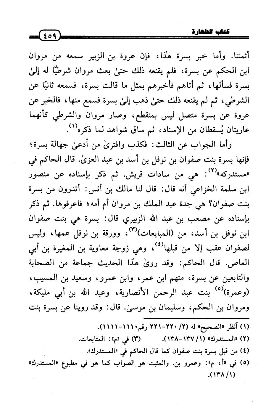 وَأما الْجَواب عَن الثَّالِث: فكذب وافترى من ادَّعَى جَهَالَة بسرة؛ فَإِنَّهَا بسرة بنت صَفْوَان بن نَوْفَل بن أَسد بن عبد الْعُزَّى. قَالَ الْحَاكِم فِي «مُسْتَدْركه» : هِيَ من سَادَات قُرَيْش. ثمَّ ذكر بِإِسْنَادِهِ عَن مَنْصُور بن سَلمَة الْخُزَاعِيّ أَنه قَالَ: قَالَ لنا مَالك بن أنس: أَتَدْرُونَ من بسرة بنت صَفْوَان؟ هِيَ جدة عبد الْملك بن مَرْوَان أم أمه؛ فاعرفوها. ثمَّ ذكر بِإِسْنَادِهِ عَن مُصعب بن عبد الله الزبيري قَالَ: بسرة هِيَ بنت صَفْوَان بن نَوْفَل بن أَسد، من (المبايعات) ، وورقة بن نَوْفَل عَمها، وَلَيْسَ لِصَفْوَان عقب إِلَّا من قبلهَا، وَهِي زَوْجَة مُعَاوِيَة بن الْمُغيرَة بن أبي الْعَاصِ. قَالَ الْحَاكِم: وَقد رَوَى هَذَا الحَدِيث جمَاعَة من الصَّحَابَة وَالتَّابِعِينَ عَن بسرة، مِنْهُم ابْن عمر، وَابْن عَمْرو، وَسَعِيد بن الْمسيب، (وَعمرَة) بنت عبد الرَّحْمَن الْأَنْصَارِيَّة، وَعبد الله بن أبي مليكَة، ومروان بن الحكم، وَسليمَان بن مُوسَى. قَالَ: وَقد روينَا عَن بسرة بنت