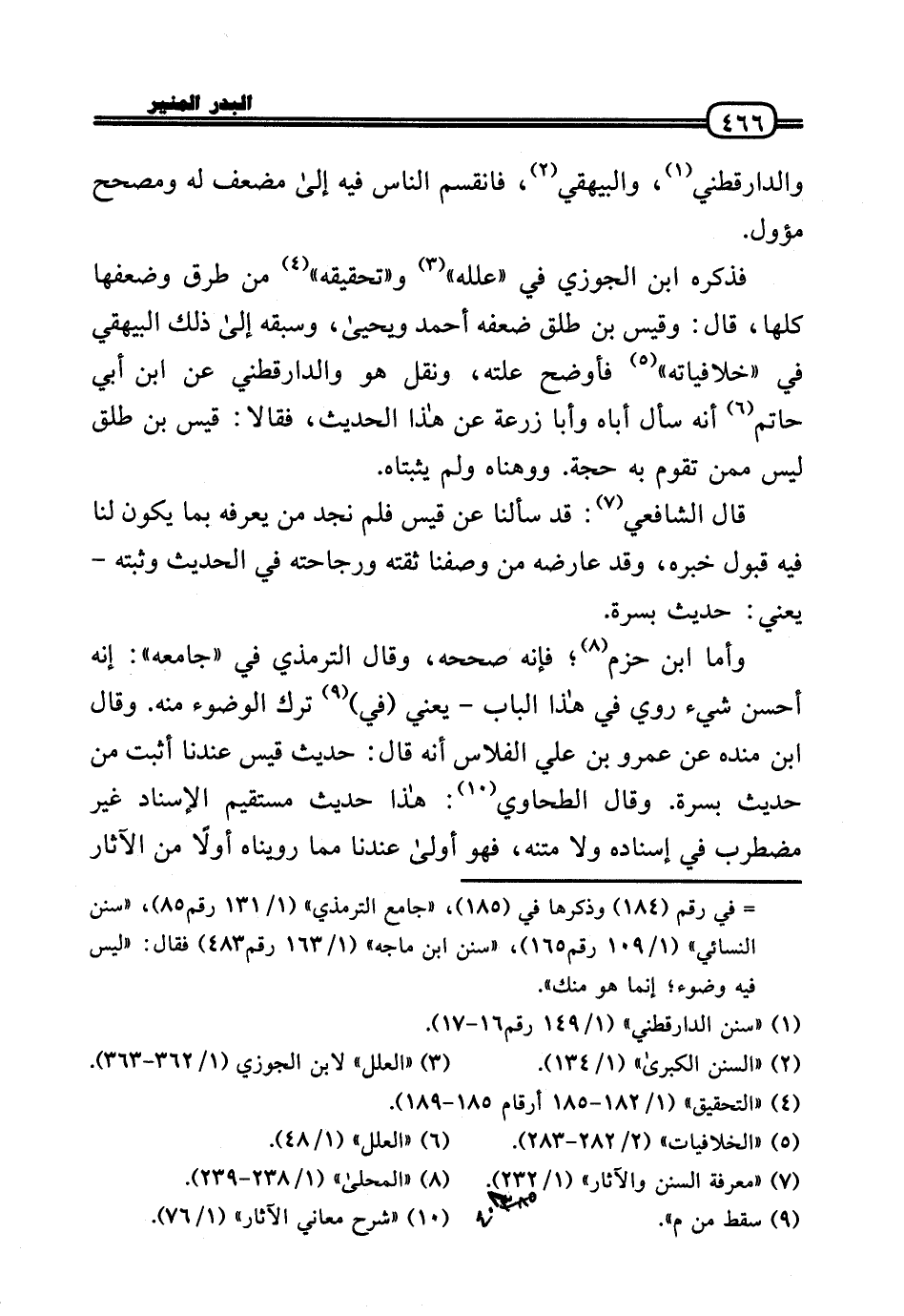 وَأما ابْن حزم؛ فَإِنَّهُ صَححهُ، وَقَالَ التِّرْمِذِيّ فِي «جَامعه» : إِنَّه أحسن شَيْء رُوِيَ فِي هَذَا الْبَاب - يَعْنِي (فِي) ترك الْوضُوء مِنْهُ. وَقَالَ ابْن مَنْدَه عَن عَمْرو بن عَلّي الفلاس أَنه قَالَ: حَدِيث قيس عندنَا أثبت من حَدِيث بسرة. وَقَالَ الطَّحَاوِيّ: هَذَا حَدِيث مُسْتَقِيم الْإِسْنَاد غير مُضْطَرب فِي إِسْنَاده وَلَا مَتنه، فَهُوَ أولَى عندنَا مِمَّا رَوَيْنَاهُ أَولا من الْآثَار