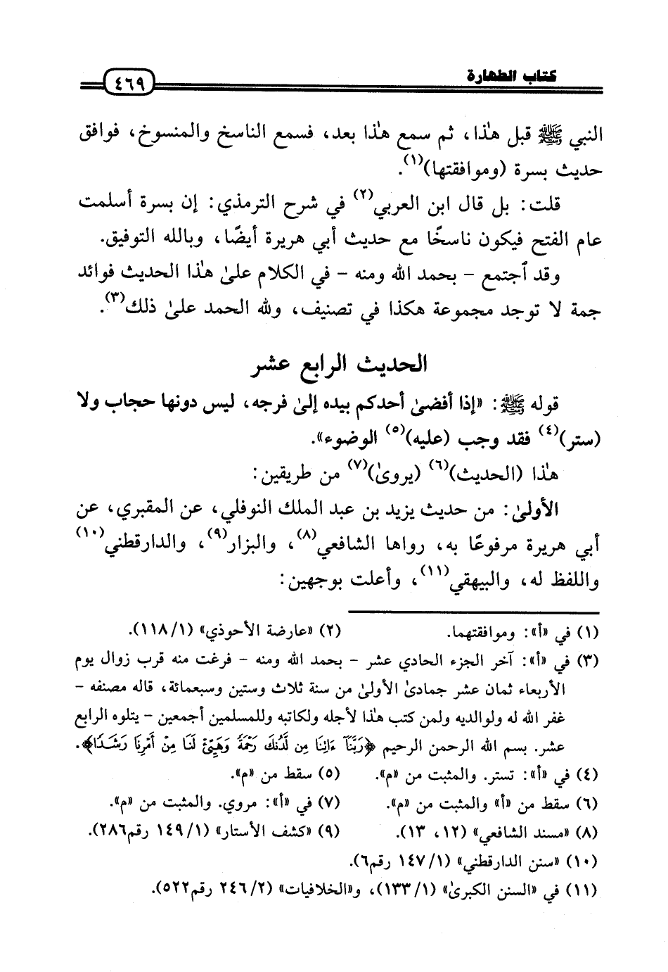 قَوْله - صَلَّى الله عَلَيْهِ وَسلم -: «إِذا أَفْضَى أحدكُم بِيَدِهِ إِلَى فرجه، لَيْسَ دونهَا حجاب وَلَا (ستر) فقد وَجب (عَلَيْهِ) الْوضُوء» .