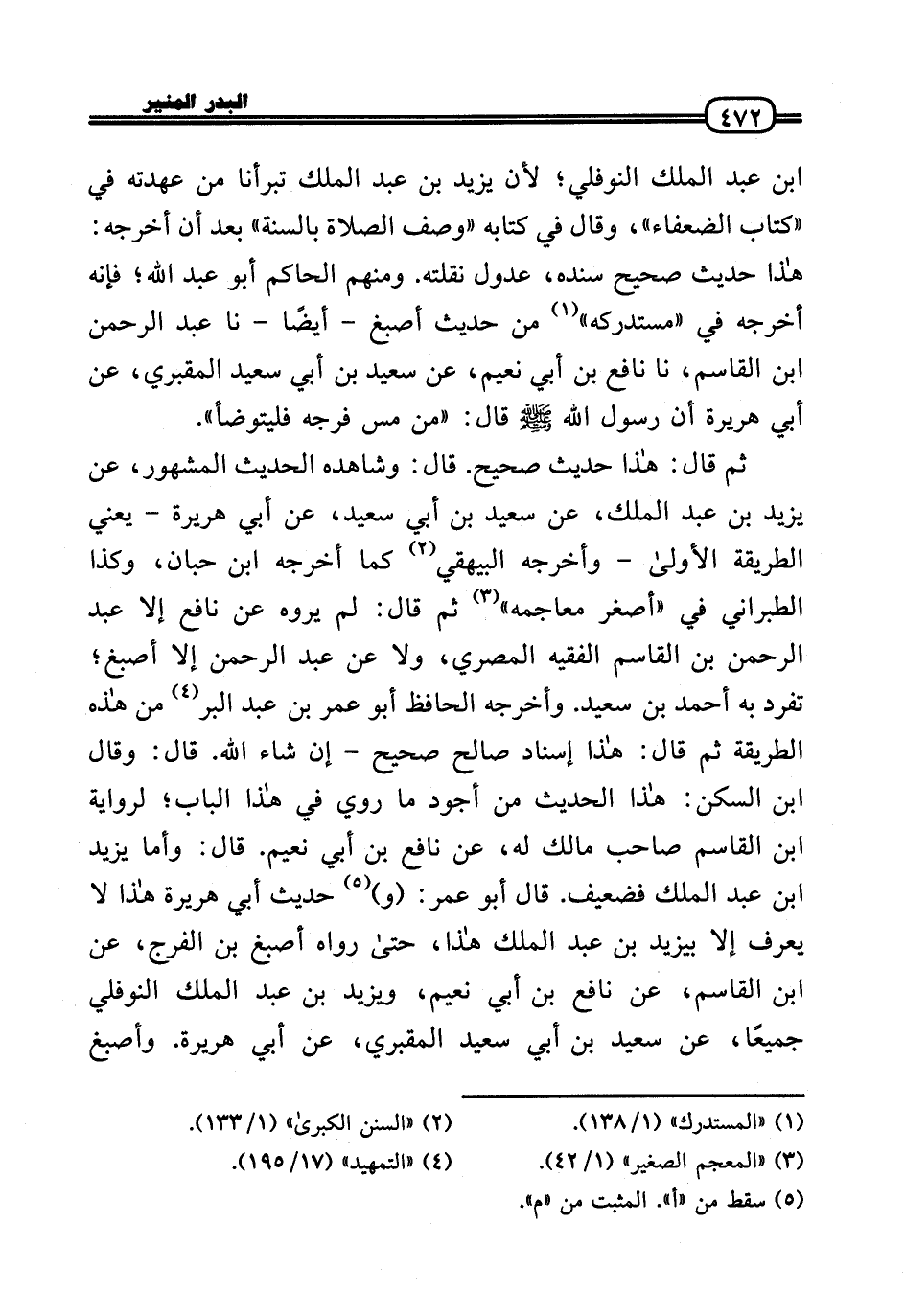 بن عبد الْملك النَّوْفَلِي؛ لِأَن يزِيد بن عبد الْملك تبرأنا من عهدته فِي «كتاب الضُّعَفَاء» ، وَقَالَ فِي كِتَابه «وصف الصَّلَاة بِالسنةِ» بعد أَن أخرجه: هَذَا حَدِيث صَحِيح سَنَده، عدُول نقلته. وَمِنْهُم الْحَاكِم أَبُو عبد الله؛ فَإِنَّهُ أخرجه فِي «مُسْتَدْركه» من حَدِيث أصبغ - أَيْضا - نَا عبد الرَّحْمَن بن الْقَاسِم، نَا نَافِع بن أبي نعيم، عَن سعيد بن أبي سعيد المَقْبُري، عَن أبي هُرَيْرَة أَن رَسُول الله - صَلَّى الله عَلَيْهِ وَسلم - قَالَ: «من مس فرجه فَليَتَوَضَّأ» .