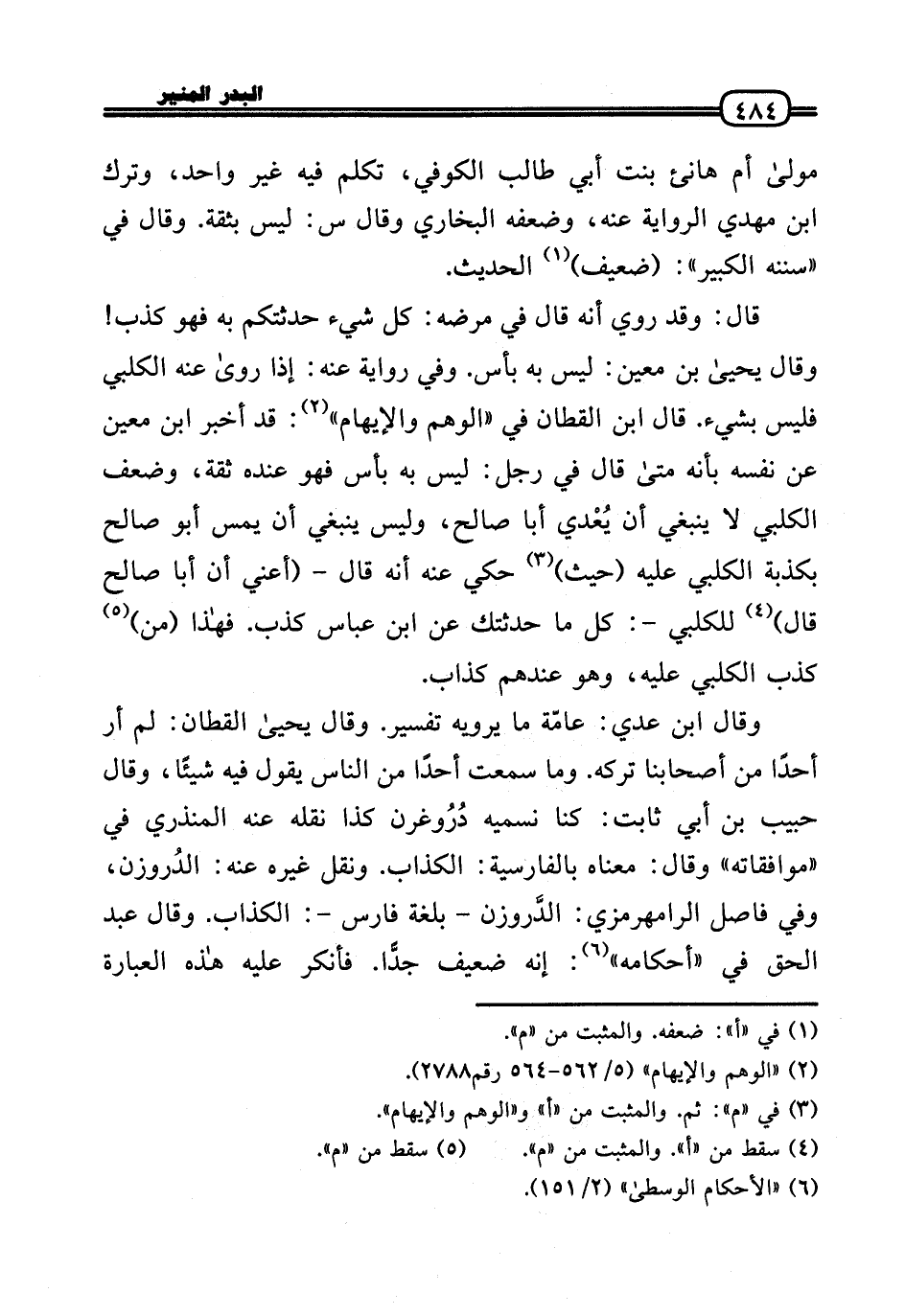 قَالَ: وَقد رُوِيَ أَنه قَالَ فِي مَرضه: كل شَيْء حدثتكم بِهِ فَهُوَ كذب! وَقَالَ يَحْيَى بن معِين: لَيْسَ بِهِ بَأْس. وَفِي رِوَايَة عَنهُ: إِذا رَوَى عَنهُ الْكَلْبِيّ فَلَيْسَ بِشَيْء. قَالَ ابْن الْقطَّان فِي «الْوَهم وَالْإِيهَام» : قد أخبر ابْن معِين عَن نَفسه بِأَنَّهُ مَتى قَالَ فِي رجل: لَيْسَ بِهِ بَأْس فَهُوَ عِنْده ثِقَة، وَضعف الْكَلْبِيّ لَا يَنْبَغِي أَن يُعْدي أَبَا صَالح، وَلَيْسَ يَنْبَغِي أَن يمس أَبُو صَالح بكذبة الْكَلْبِيّ عَلَيْهِ (حَيْثُ) حُكيَ عَنهُ أَنه قَالَ - (أَعنِي أَن أَبَا صَالح قَالَ) للكلبي -: كل مَا حدثتك عَن ابْن عَبَّاس كذب. فَهَذَا (من) كذب الْكَلْبِيّ عَلَيْهِ، وَهُوَ عِنْدهم كَذَّاب.