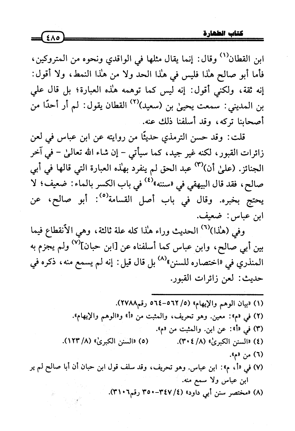 قلت: وَقد حسن التِّرْمِذِيّ حَدِيثا من رِوَايَته عَن ابْن عَبَّاس فِي لعن زائرات الْقُبُور، لكنه غير جيد، كَمَا سَيَأْتِي - إِن شَاءَ الله تَعَالَى - فِي آخر الْجَنَائِز. (عَلَى أَن) عبد الْحق لم ينْفَرد بِهَذِهِ الْعبارَة الَّتِي قَالَهَا فِي أبي صَالح، فقد قَالَ الْبَيْهَقِيّ فِي «سنَنه» فِي بَاب الْكسر بِالْمَاءِ: ضَعِيف؛ لَا يحْتَج بِخَبَرِهِ. وَقَالَ فِي بَاب أصل الْقسَامَة: أَبُو صَالح، عَن ابْن عَبَّاس: ضَعِيف.