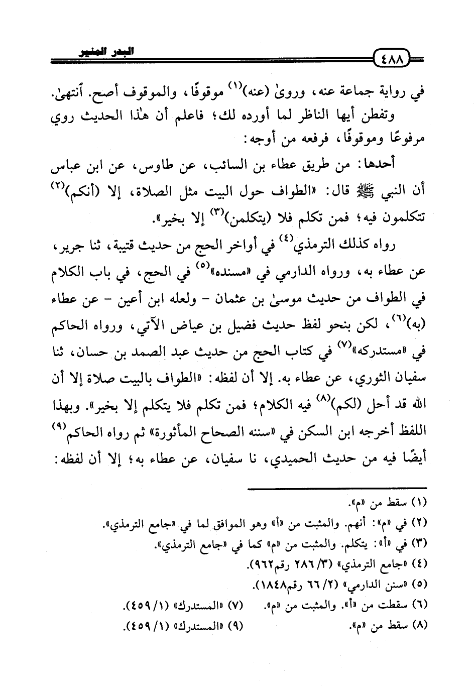 رَوَاهُ كَذَلِك التِّرْمِذِيّ فِي أَوَاخِر الْحَج من حَدِيث قُتَيْبَة، ثَنَا جرير، عَن عَطاء بِهِ، وَرَوَاهُ الدَّارمِيّ فِي «مُسْنده» فِي الْحَج، فِي بَاب الْكَلَام فِي الطّواف من حَدِيث مُوسَى بن عُثْمَان - وَلَعَلَّه ابْن أعين - عَن عَطاء (بِهِ) ، لَكِن بِنَحْوِ لفظ حَدِيث فُضَيْل بن عِيَاض الْآتِي، وَرَوَاهُ الْحَاكِم فِي «مُسْتَدْركه» فِي كتاب الْحَج من حَدِيث عبد الصَّمد بن حسان، ثَنَا سُفْيَان الثَّوْريّ، عَن عَطاء بِهِ. إِلَّا أَن لَفظه: «الطّواف بِالْبَيْتِ صَلَاة إِلَّا أَن الله قد أحل (لكم) فِيهِ الْكَلَام؛ فَمن تكلم فَلَا يتَكَلَّم إِلَّا بِخَير» . وَبِهَذَا اللَّفْظ أخرجه ابْن السكن فِي «سنَنه الصِّحَاح المأثورة» ثمَّ رَوَاهُ الْحَاكِم أَيْضا فِيهِ من حَدِيث الْحميدِي، نَا سُفْيَان، عَن عَطاء بِهِ؛ إِلَّا أَن لَفظه: