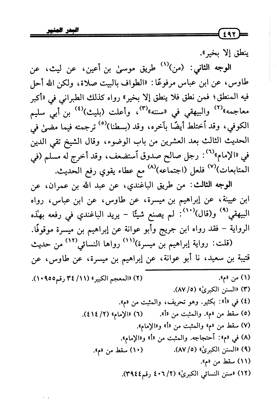 الْوَجْه الثَّانِي: (من) طَرِيق مُوسَى بن أعين، عَن لَيْث، عَن طَاوس، عَن ابْن عَبَّاس مَرْفُوعا: «الطّواف بِالْبَيْتِ صَلَاة، وَلَكِن الله أحل فِيهِ الْمنطق؛ فَمن نطق فَلَا ينْطق إِلَّا بِخَير» رَوَاهُ كَذَلِك الطَّبَرَانِيّ فِي «أكبر معاجمه» وَالْبَيْهَقِيّ فِي «سنَنه» ، وأعلت (بليث) بن أبي سليم الْكُوفِي، وَقد اخْتَلَط أَيْضا بِآخِرهِ، وَقد (بسطنا) تَرْجَمته فِيمَا مَضَى فِي الحَدِيث الثَّالِث بعد الْعشْرين من بَاب الْوضُوء، وَقَالَ الشَّيْخ تَقِيّ الدَّين فِي «الإِمَام» : رجل صَالح صَدُوق استضعف، وَقد أخرج لَهُ مُسلم (فِي المتابعات) فَلَعَلَّ (اجتماعه) مَعَ عَطاء يُقَوي رفع الحَدِيث.