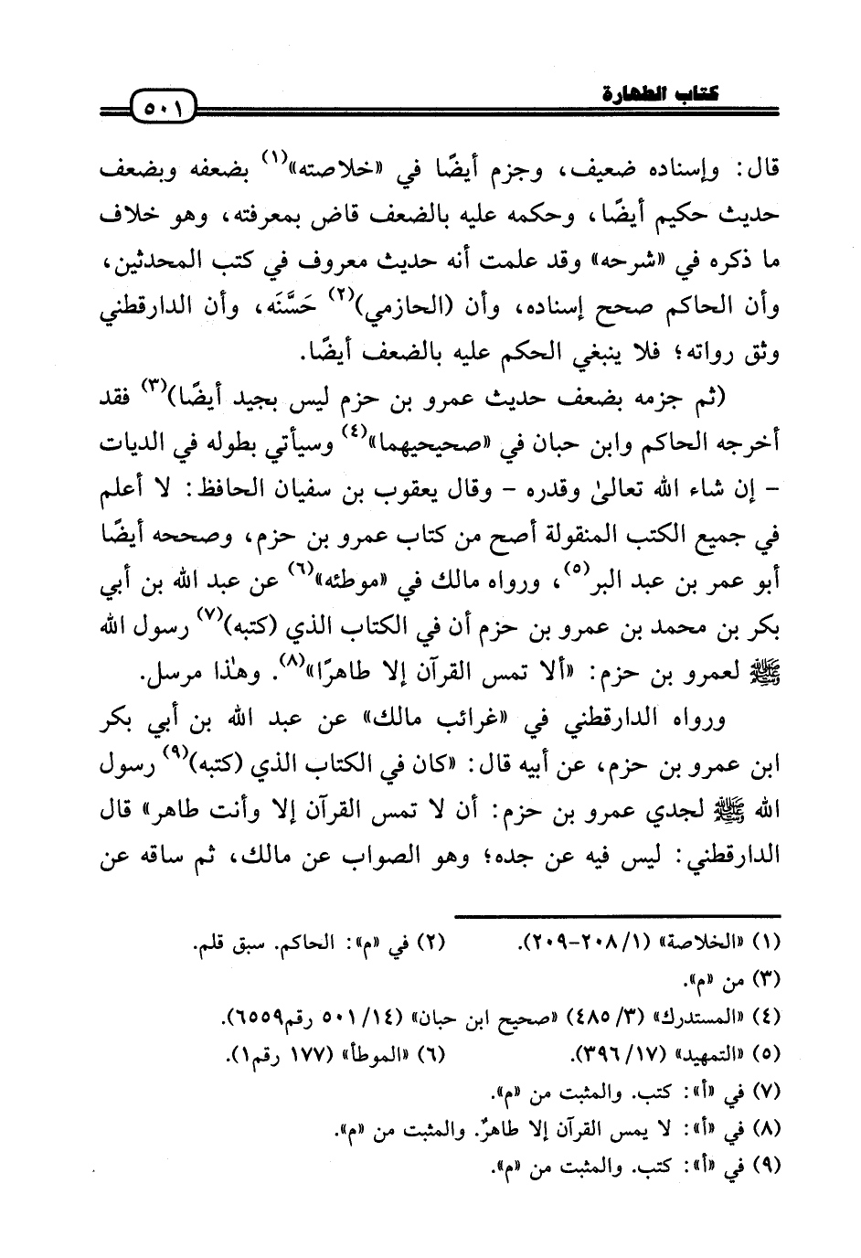 (ثمَّ جزمه بِضعْف حَدِيث عَمْرو بن حزم لَيْسَ بجيد أَيْضا) فقد أخرجه الْحَاكِم وَابْن حبَان فِي «صَحِيحَيْهِمَا» وَسَيَأْتِي بِطُولِهِ فِي الدِّيات - إِن شَاءَ الله تَعَالَى وَقدره - وَقَالَ يَعْقُوب بن سُفْيَان الْحَافِظ: لَا أعلم فِي جَمِيع الْكتب المنقولة أصح من كتاب عَمْرو بن حزم، وَصَححهُ أَيْضا أَبُو عمر بن عبد الْبر، وَرَوَاهُ مَالك فِي «موطئِهِ» عَن عبد الله بن أبي بكر بن مُحَمَّد بن عَمْرو بن حزم أَن فِي الْكتاب الَّذِي (كتبه) رَسُول الله - صَلَّى الله عَلَيْهِ وَسلم - لعَمْرو بن حزم: «أَلا تمس الْقُرْآن إِلَّا طَاهِرا» . وَهَذَا مُرْسل.