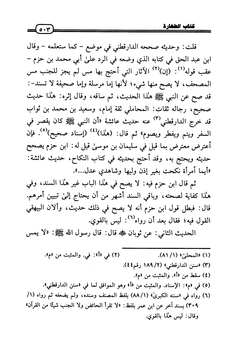 قلت: وَحَدِيثه صَححهُ الدَّارَقُطْنِيّ فِي مَوضِع - كَمَا ستعلمه - وَقَالَ ابْن عبد الْحق فِي كِتَابه الَّذِي وَضعه فِي الرَّد عَلَى أبي مُحَمَّد بن حزم - عقب قَوْله: (إِن) الْآثَار الَّتِي احْتج بهَا مس لم يجز للْجنب من الْمُصحف، لَا يَصح مِنْهَا شَيْء؛ لِأَنَّهَا إِمَّا مُرْسلَة وَإِمَّا صحيفَة لَا تسند -: قد صَحَّ عَن النَّبِي - صَلَّى الله عَلَيْهِ وَسلم - هَذَا الحَدِيث، ثمَّ سَاقه، وَقَالَ إثره: هَذَا حَدِيث صَحِيح، رِجَاله ثِقَات: الْمحَامِلِي ثِقَة إِمَام، وَسَعِيد بن مُحَمَّد بن ثَوَاب قد خرج الدَّارَقُطْنِيّ عَنهُ حَدِيث عَائِشَة «أَن النَّبِي - صَلَّى الله عَلَيْهِ وَسلم - كَانَ يقصر فِي السّفر وَيتم وَيفْطر ويصوم» ثمَّ قَالَ: (هَذَا) (إِسْنَاد صَحِيح) . فَإِن اعْترض معترض بِمَا قيل فِي سُلَيْمَان بن مُوسَى قيل لَهُ: ابْن حزم يصحح حَدِيثه ويحتج بِهِ، وَقد احْتج بحَديثه فِي كتاب النِّكَاح، حَدِيث عَائِشَة: «أَيّمَا امْرَأَة نكحت بِغَيْر إِذن وَليهَا وشاهدي عدل ... » .