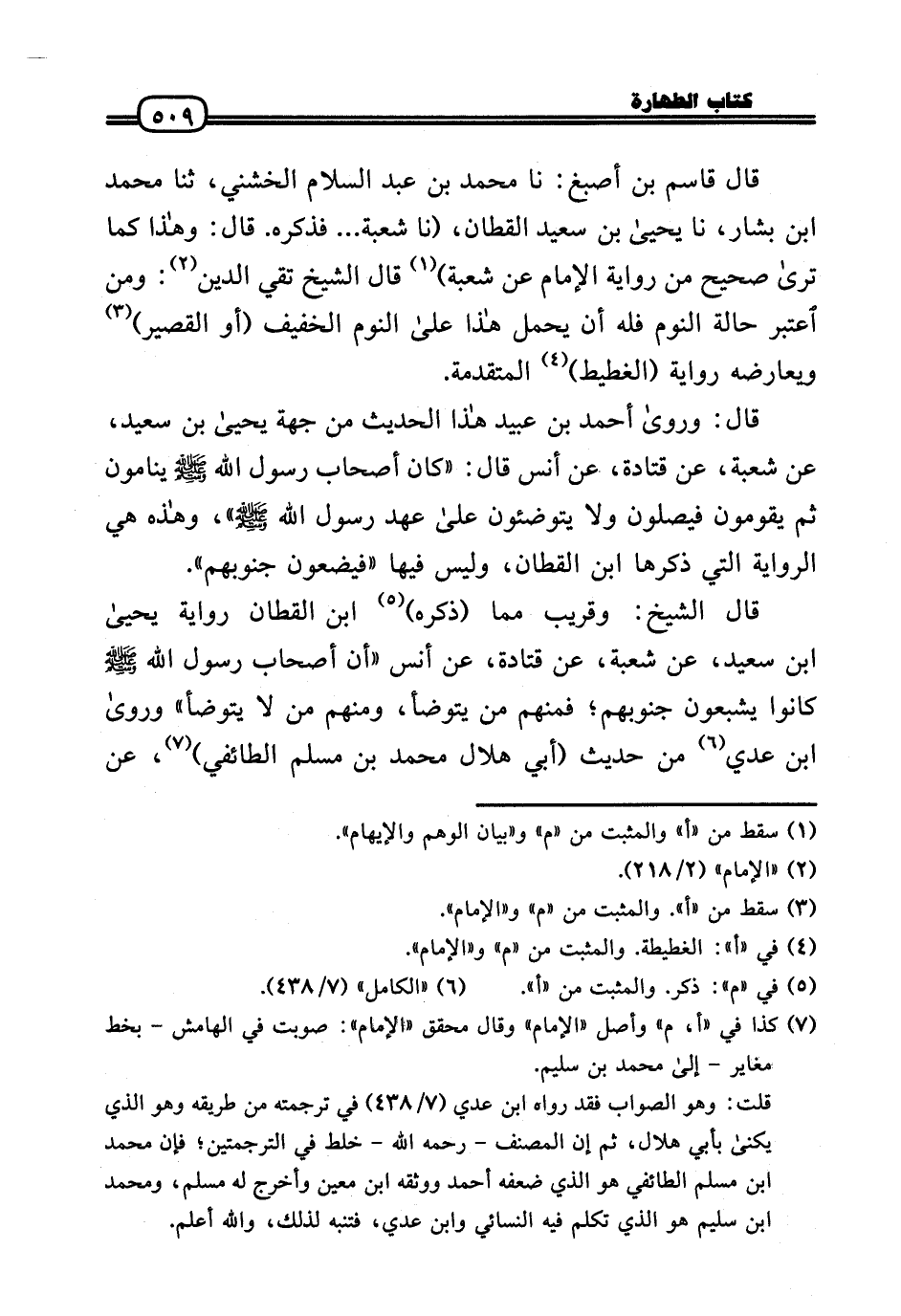 قَالَ قَاسم بن أصبغ: نَا مُحَمَّد بن عبد السَّلَام الْخُشَنِي، ثَنَا مُحَمَّد بن بشار، نَا يَحْيَى بن سعيد الْقطَّان، (نَا شُعْبَة ... فَذكره. قَالَ: وَهَذَا كَمَا ترَى صَحِيح من رِوَايَة الإِمَام عَن شُعْبَة) قَالَ الشَّيْخ تَقِيّ الدَّين: وَمن اعْتبر حَالَة النّوم فَلهُ أَن يحمل هَذَا عَلَى النّوم الْخَفِيف (أَو الْقصير) ويعارضه رِوَايَة (الغطيط) الْمُتَقَدّمَة.