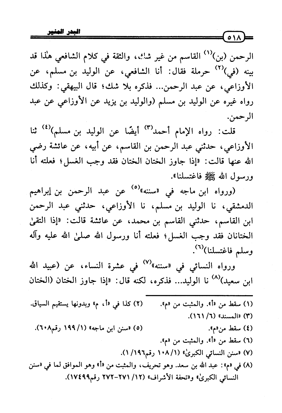 قلت: رَوَاهُ الإِمَام أَحْمد أَيْضا عَن الْوَلِيد بن مُسلم) ثَنَا الْأَوْزَاعِيّ، حَدثنِي عبد الرَّحْمَن بن الْقَاسِم، عَن أَبِيه، عَن عَائِشَة رَضي اللهُ عَنها قَالَت: «إِذا جَاوز الْخِتَان الْخِتَان فقد وَجب الْغسْل؛ فعلته أَنا وَرَسُول الله - صَلَّى الله عَلَيْهِ وَسلم - فاغتسلنا» .
