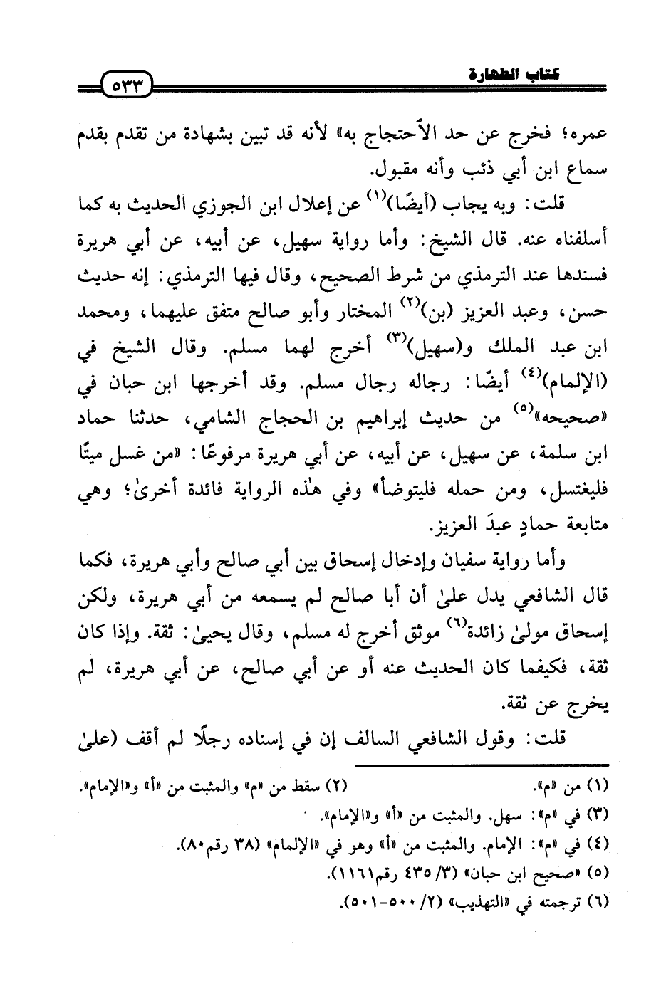 قلت: وَبِه يُجَاب (أَيْضا) عَن إعلال ابْن الْجَوْزِيّ الحَدِيث بِهِ كَمَا أسلفناه عَنهُ. قَالَ الشَّيْخ: وَأما رِوَايَة سُهَيْل، عَن أَبِيه، عَن أبي هُرَيْرَة فسندها عِنْد التِّرْمِذِيّ من شَرط الصَّحِيح، وَقَالَ فِيهَا التِّرْمِذِيّ: إِنَّه حَدِيث حسن، وَعبد الْعَزِيز (بن) الْمُخْتَار وَأَبُو صَالح مُتَّفق عَلَيْهِمَا، وَمُحَمّد بن عبد الْملك و (سُهَيْل) أخرج لَهما مُسلم. وَقَالَ الشَّيْخ فِي (الْإِلْمَام) أَيْضا: رِجَاله رجال مُسلم. وَقد أخرجهَا ابْن حبَان فِي «صَحِيحه» من حَدِيث إِبْرَاهِيم بن الْحجَّاج الشَّامي، حَدثنَا حَمَّاد بن سَلمَة، عَن سُهَيْل، عَن أَبِيه، عَن أبي هُرَيْرَة مَرْفُوعا: «من غسل مَيتا فليغتسل، وَمن حمله فَليَتَوَضَّأ» وَفِي هَذِه الرِّوَايَة فَائِدَة أُخْرَى؛ وَهِي مُتَابعَة حمادٍ عبدَ الْعَزِيز.