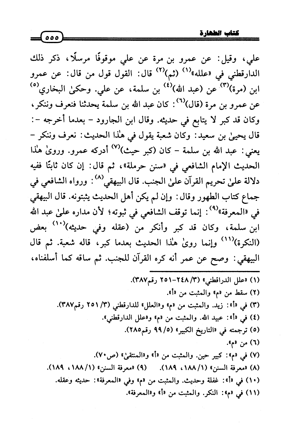 عَلّي، وَقيل: عَن عَمْرو بن مرّة عَن عَلّي مَوْقُوفا مُرْسلا، ذكر ذَلِك الدَّارَقُطْنِيّ فِي «علله» (ثمَّ) قَالَ: القَوْل قَول من قَالَ: عَن عَمْرو بن (مرّة) عَن (عبد الله) بن سَلمَة، عَن عَلّي. وَحَكَى البُخَارِيّ عَن عَمْرو بن مرّة (قَالَ) : كَانَ عبد الله بن سَلمَة يحدثنا فنعرف وننكر، وَكَانَ قد كبر لَا يُتَابع فِي حَدِيثه. وَقَالَ ابْن الْجَارُود - بَعْدَمَا أخرجه -: قَالَ يَحْيَى بن سعيد: وَكَانَ شُعْبَة يَقُول فِي هَذَا الحَدِيث: نَعْرِف وننكر - يَعْنِي: عبد الله بن سَلمَة - كَانَ (كبر حَيْثُ) أدْركهُ عَمْرو. وَرَوَى هَذَا الحَدِيث الإِمَام الشَّافِعِي فِي «سنَن حَرْمَلَة» ، ثمَّ قَالَ: إِن كَانَ ثَابتا فَفِيهِ دلَالَة عَلَى تَحْرِيم الْقُرْآن عَلَى الْجنب. قَالَ الْبَيْهَقِيّ: وَرَوَاهُ الشَّافِعِي فِي جماع كتاب الطّهُور وَقَالَ: وَإِن لم يكن أهل الحَدِيث يثبتونه. قَالَ الْبَيْهَقِيّ فِي «الْمعرفَة» : إِنَّمَا توقف الشَّافِعِي فِي ثُبُوته؛ لِأَن مَدَاره عَلَى عبد الله بن سَلمَة، وَكَانَ قد كبر وَأنكر من (عقله وَفِي حَدِيثه) بعض (النكرَة) وَإِنَّمَا رَوَى هَذَا الحَدِيث بَعْدَمَا كبر، قَالَه شُعْبَة. ثمَّ قَالَ الْبَيْهَقِيّ: وَصَحَّ عَن عمر أَنه كره الْقُرْآن للْجنب. ثمَّ سَاقه كَمَا أسلفناه،
