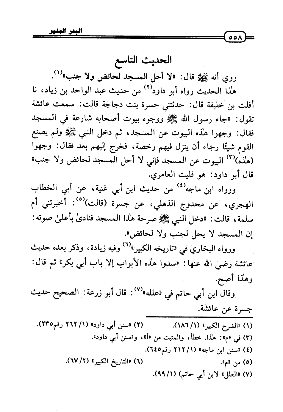 هَذَا الحَدِيث رَوَاهُ أَبُو دَاوُد من حَدِيث عبد الْوَاحِد بن زِيَاد، نَا أفلت بن خَليفَة قَالَ: حَدَّثتنِي جسرة بنت دجَاجَة قَالَت: سَمِعت عَائِشَة تَقول: «جَاءَ رَسُول الله - صَلَّى الله عَلَيْهِ وَسلم - ووجوه بيُوت أَصْحَابه شارعة فِي الْمَسْجِد فَقَالَ: وجهوا هَذِه الْبيُوت عَن الْمَسْجِد، ثمَّ دخل النَّبِي - صَلَّى الله عَلَيْهِ وَسلم - وَلم يصنع الْقَوْم شَيْئا رَجَاء أَن ينزل فيهم رخصَة، فَخرج إِلَيْهِم بعد فَقَالَ: وجهوا (هَذِه) الْبيُوت عَن الْمَسْجِد فَإِنِّي لَا أحل الْمَسْجِد لحائض وَلَا جنب» قَالَ أَبُو دَاوُد: هُوَ فليت العامري.