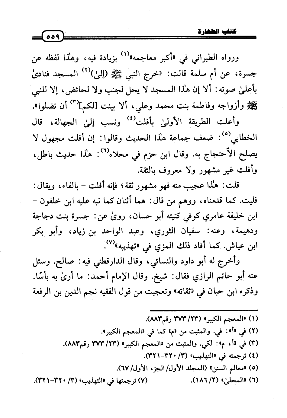 وَرَوَاهُ الطَّبَرَانِيّ فِي «أكبر معاجمه» بِزِيَادَة فِيهِ، وَهَذَا لَفظه عَن جسرة، عَن أم سَلمَة قَالَت: «خرج النَّبِي صَلَّى اللَّهُ عَلَيْهِ وَسَلَّم َ (إِلَى) الْمَسْجِد فَنَادَى بِأَعْلَى صَوته: أَلا إِن هَذَا الْمَسْجِد لَا يحل لجنب وَلَا لحائض، إِلَّا للنَّبِي صَلَّى اللَّهُ عَلَيْهِ وَسَلَّم َ وأزواجه وَفَاطِمَة بنت مُحَمَّد وَعلي، أَلا بيّنت [لكم] أَن تضلوا» .