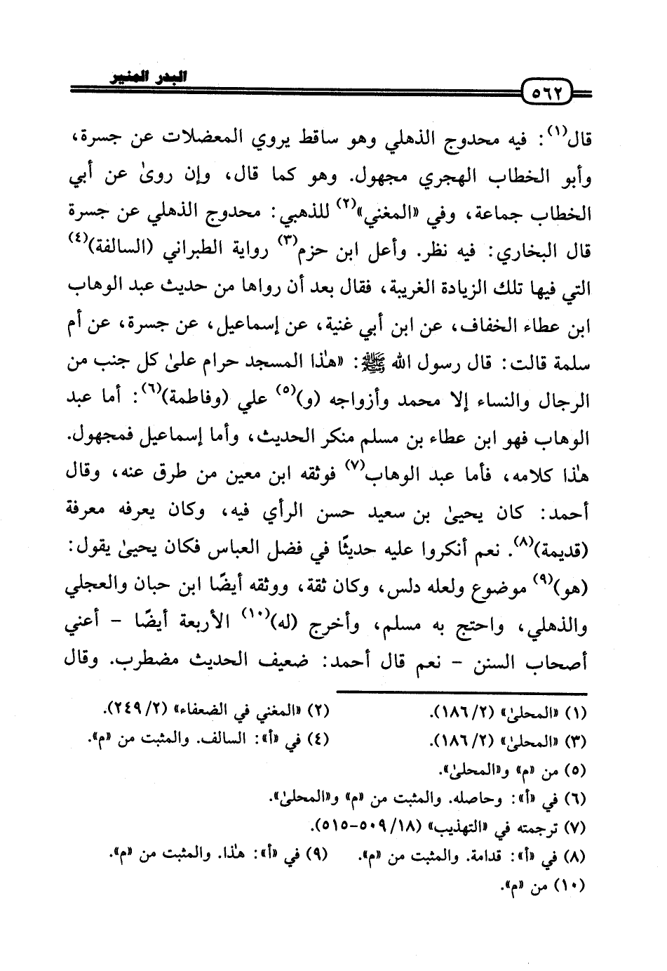 قَالَ: فِيهِ محدوج الذهلي وَهُوَ سَاقِط يروي المعضلات عَن جسرة، وَأَبُو الْخطاب الهجري مَجْهُول. وَهُوَ كَمَا قَالَ، وَإِن رَوَى عَن أبي الْخطاب جمَاعَة، وَفِي «الْمُغنِي» للذهبي: محدوج الذهلي عَن جسرة قَالَ البُخَارِيّ: فِيهِ نظر. وأعل ابْن حزم رِوَايَة الطَّبَرَانِيّ (السالفة) الَّتِي فِيهَا تِلْكَ الزِّيَادَة الغريبة، فَقَالَ بعد أَن رَوَاهَا من حَدِيث عبد الْوَهَّاب بن عَطاء الْخفاف، عَن ابْن أبي غنية، عَن إِسْمَاعِيل، عَن جسرة، عَن أم سَلمَة قَالَت: قَالَ رَسُول الله صَلَّى اللَّهُ عَلَيْهِ وَسَلَّم َ: «هَذَا الْمَسْجِد حرَام عَلَى كل جنب من الرِّجَال وَالنِّسَاء إِلَّا مُحَمَّد وأزواجه (و) عَلّي (وَفَاطِمَة) : أما عبد الْوَهَّاب فَهُوَ ابْن عَطاء بن مُسلم مُنكر الحَدِيث، وَأما إِسْمَاعِيل فمجهول. هَذَا كَلَامه، فَأَما عبد الْوَهَّاب فوثقه ابْن معِين من طرق عَنهُ، وَقَالَ أَحْمد: كَانَ يَحْيَى بن سعيد حسن الرَّأْي فِيهِ، وَكَانَ يعرفهُ معرفَة (قديمَة) . نعم أَنْكَرُوا عَلَيْهِ حَدِيثا فِي فضل الْعَبَّاس فَكَانَ يَحْيَى يَقُول: (هُوَ) مَوْضُوع وَلَعَلَّه دلّس، وَكَانَ ثِقَة، وَوَثَّقَهُ أَيْضا ابْن حبَان وَالْعجلِي والذهلي، وَاحْتج بِهِ مُسلم، وَأخرج (لَهُ) الْأَرْبَعَة أَيْضا - أَعنِي أَصْحَاب السّنَن - نعم قَالَ أَحْمد: ضَعِيف الحَدِيث مُضْطَرب. وَقَالَ