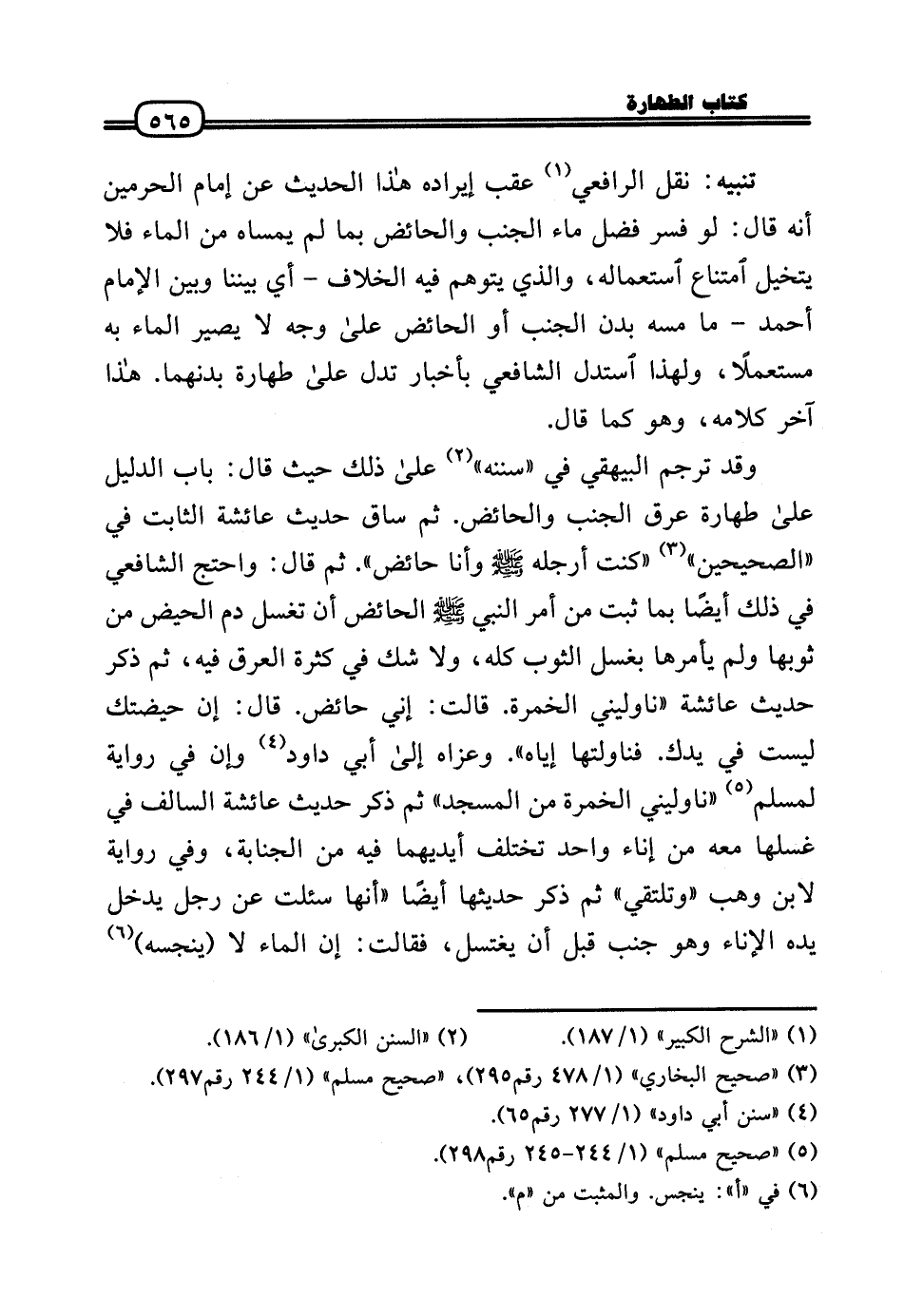 تَنْبِيه: نقل الرَّافِعِيّ عقب إِيرَاده هَذَا الحَدِيث عَن إِمَام الْحَرَمَيْنِ أَنه قَالَ: لَو فسر فضل مَاء الْجنب وَالْحَائِض بِمَا لم يمساه من المَاء فَلَا يتخيل امْتنَاع اسْتِعْمَاله، وَالَّذِي يتَوَهَّم فِيهِ الْخلاف - أَي بَيْننَا وَبَين الإِمَام أَحْمد - مَا مَسّه بدن الْجنب أَو الْحَائِض عَلَى وَجه لَا يصير المَاء بِهِ مُسْتَعْملا، وَلِهَذَا اسْتدلَّ الشَّافِعِي بأخبار تدل عَلَى طَهَارَة بدنهما. هَذَا آخر كَلَامه، وَهُوَ كَمَا قَالَ.