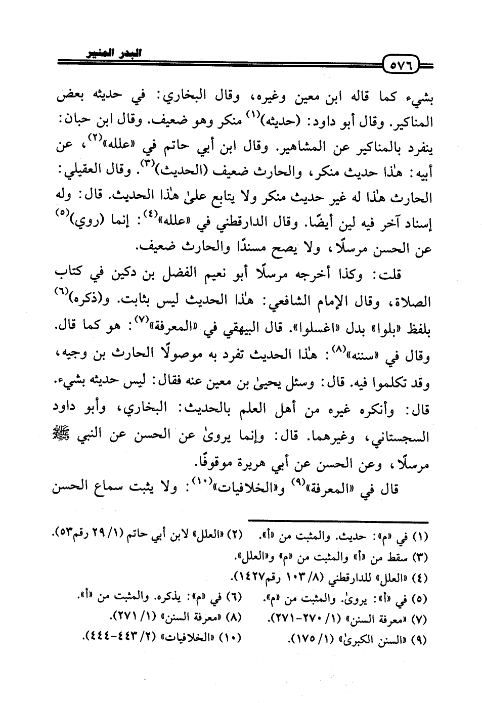 بِشَيْء كَمَا قَالَه ابْن معِين وَغَيره، وَقَالَ البُخَارِيّ: فِي حَدِيثه بعض الْمَنَاكِير. وَقَالَ أَبُو دَاوُد: (حَدِيثه) مُنكر وَهُوَ ضَعِيف. وَقَالَ ابْن حبَان: ينْفَرد بِالْمَنَاكِيرِ عَن الْمَشَاهِير. وَقَالَ ابْن أبي حَاتِم فِي «علله» ، عَن أَبِيه: هَذَا حَدِيث مُنكر، والْحَارث ضَعِيف (الحَدِيث) . وَقَالَ الْعقيلِيّ: الْحَارِث هَذَا لَهُ غير حَدِيث مُنكر وَلَا يُتَابع عَلَى هَذَا الحَدِيث. قَالَ: وَله إِسْنَاد آخر فِيهِ لين أَيْضا. وَقَالَ الدَّارَقُطْنِيّ فِي «علله» : إِنَّمَا (رُوِيَ) عَن الْحسن مُرْسلا، وَلَا يَصح مُسْندًا والْحَارث ضَعِيف.