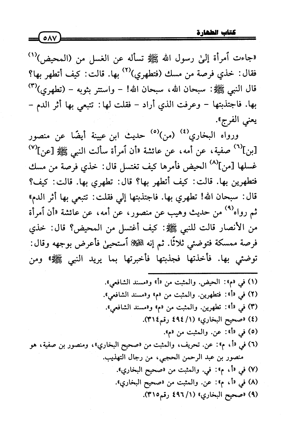 وَرَوَاهُ البُخَارِيّ (من) حَدِيث ابْن عُيَيْنَة أَيْضا عَن مَنْصُور [بن] صَفِيَّة، عَن أمه، عَن عَائِشَة «أَن امْرَأَة سَأَلت النَّبِي صَلَّى اللَّهُ عَلَيْهِ وَسَلَّم َ [عَن] غسلهَا [من] الْحيض فَأمرهَا كَيفَ تَغْتَسِل قَالَ: خذي فرْصَة من مسك فتطهرين بهَا. قَالَت: كَيفَ أتطهر بهَا؟ قَالَ: تطهري بهَا. قَالَت: كَيفَ؟ قَالَ: سُبْحَانَ الله! تطهري بهَا. فاجتذبتها إِلَيّ فَقلت: تتبعي بهَا أثر الدَّم» ثمَّ رَوَاهُ من حَدِيث وهيب عَن مَنْصُور، عَن أمه، عَن عَائِشَة «أَن امْرَأَة من الْأَنْصَار قَالَت للنَّبِي صَلَّى اللَّهُ عَلَيْهِ وَسَلَّم َ: كَيفَ أَغْتَسِل من الْمَحِيض؟ قَالَ: خذي فرْصَة ممسكة فتوضئي ثَلَاثًا. ثمَّ إِنَّه عَلَيْهِ السَّلَام استحيى فَأَعْرض بِوَجْهِهِ وَقَالَ: توضئي بهَا. فأخذتها فجذبتها فَأَخْبَرتهَا بِمَا يُرِيد النَّبِي - صَلَّى الله عَلَيْهِ وَسلم -» وَمن