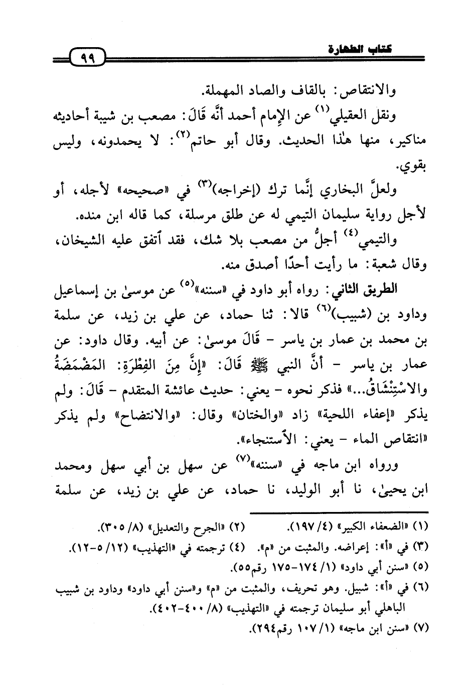 الطَّرِيق الثَّانِي: رَوَاهُ أَبُو دَاوُد فِي «سنَنه» عَن مُوسَى بن إِسْمَاعِيل وَدَاوُد بن (شبيب) قَالَا: ثَنَا حَمَّاد، عَن عَلّي بن زيد، عَن سَلمَة بن مُحَمَّد بن عمار بن يَاسر - قَالَ مُوسَى: عَن أَبِيه. وَقَالَ دَاوُد: عَن عمار بن يَاسر - أنَّ النَّبِي - صَلَّى الله عَلَيْهِ وَسلم - قَالَ: «إِنَّ مِنَ الْفِطْرَةِ: المَضْمَضَةُ والاسْتِنْشَاقُ ... » فَذكر نَحوه - يَعْنِي: حَدِيث عَائِشَة الْمُتَقَدّم - قَالَ: وَلم يذكر «إعفاء اللِّحْيَة» زَاد «والختان» وَقَالَ: «والانتضاح» وَلم يذكر «انتقاص المَاء - يَعْنِي: الِاسْتِنْجَاء» .