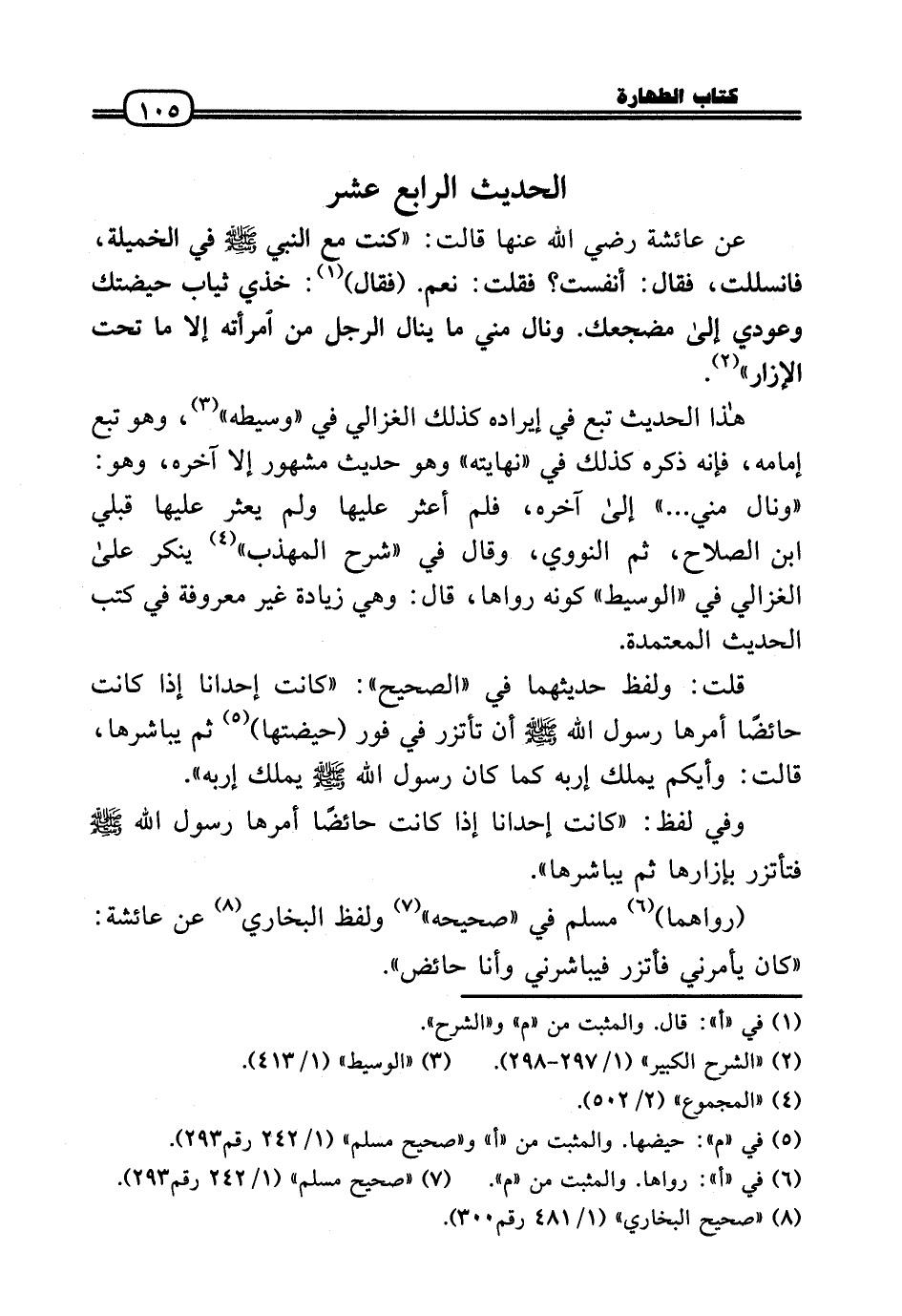 عَن عَائِشَة رَضي اللهُ عَنها قَالَت: «كنت مَعَ النَّبِي صَلَّى اللَّهُ عَلَيْهِ وَسَلَّم َ فِي الخميلة، فانسللت، فَقَالَ: أنفست؟ فَقلت: نعم. (فَقَالَ) : خذي ثِيَاب حيضتك وعودي إِلَى مضجعك. ونال مني مَا ينَال الرجل من امْرَأَته إِلَّا مَا تَحت الْإِزَار» .