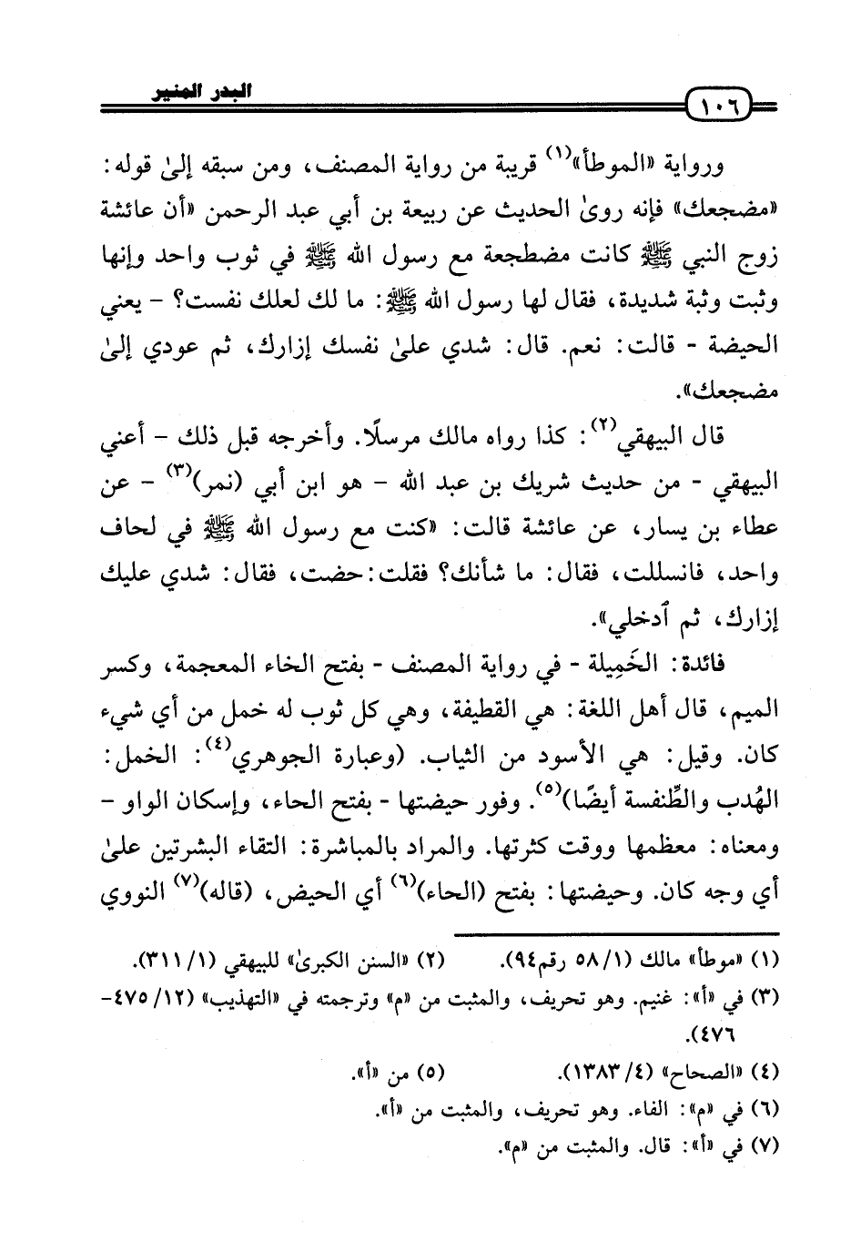 قَالَ الْبَيْهَقِيّ: كَذَا رَوَاهُ مَالك مُرْسلا. وَأخرجه قبل ذَلِك - أَعنِي الْبَيْهَقِيّ - من حَدِيث شريك بن عبد الله - هُوَ ابْن أبي (نمر) - عَن عَطاء بن يسَار، عَن عَائِشَة قَالَت: «كنت مَعَ رَسُول الله صَلَّى اللَّهُ عَلَيْهِ وَسَلَّم َ فِي لِحَاف وَاحِد، فانسللت، فَقَالَ: مَا شَأْنك؟ فَقلت: حِضْت، فَقَالَ: شدي عَلَيْك إزارك، ثمَّ ادخلي» .