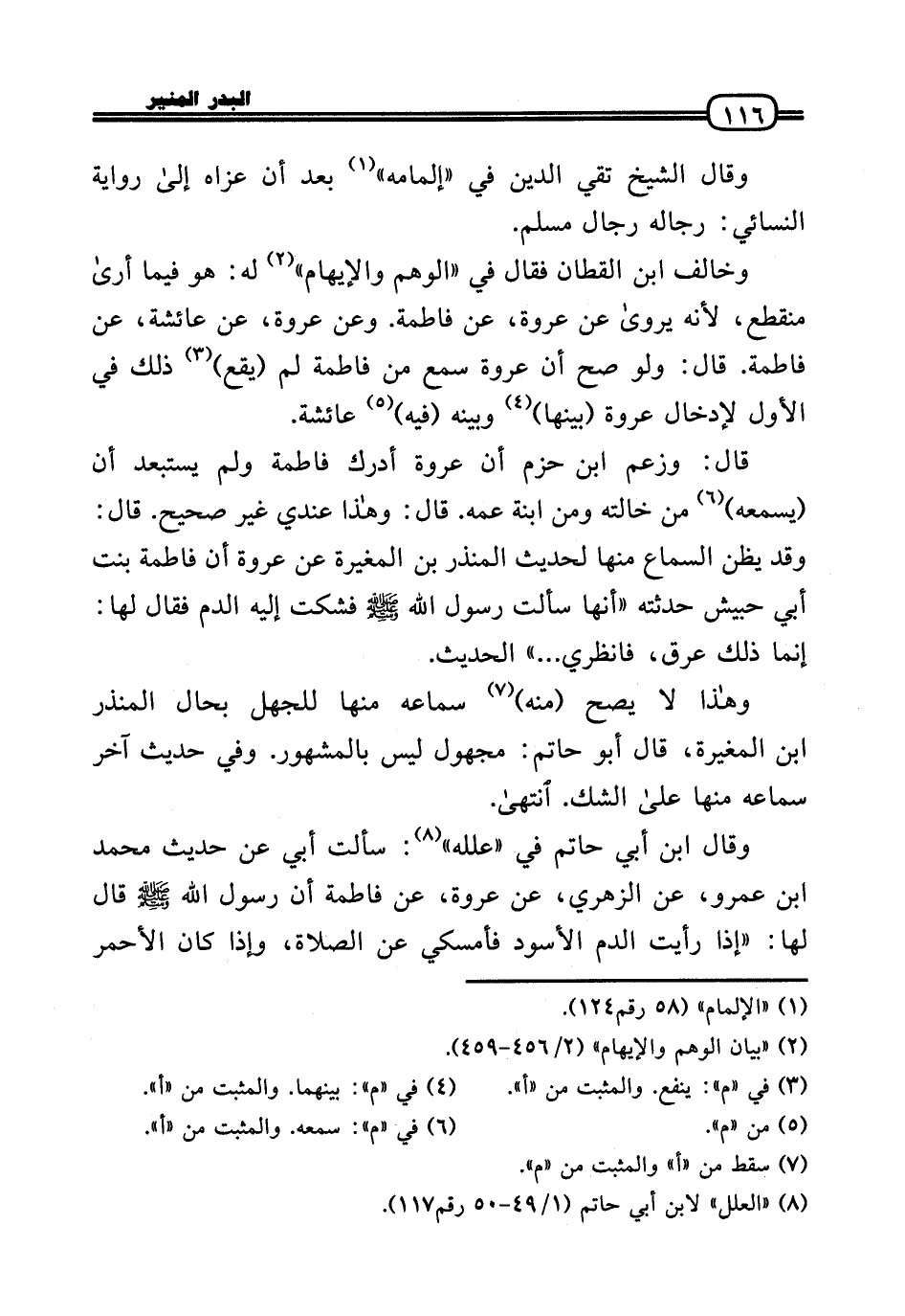 وَخَالف ابْن الْقطَّان فَقَالَ فِي «الْوَهم وَالْإِيهَام» لَهُ: هُوَ فِيمَا أرَى مُنْقَطع، لِأَنَّهُ يرْوَى عَن عُرْوَة، عَن فَاطِمَة. وَعَن عُرْوَة، عَن عَائِشَة، عَن فَاطِمَة. قَالَ: وَلَو صَحَّ أَن عُرْوَة سمع من فَاطِمَة لم (يَقع) ذَلِك فِي الأول لإدخال عُرْوَة (بَينهَا) وَبَينه (فِيهِ) عَائِشَة.