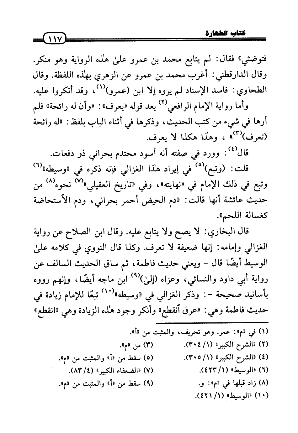 قَالَ البُخَارِيّ: لَا يَصح وَلَا يُتَابع عَلَيْهِ. وَقَالَ ابْن الصّلاح عَن رِوَايَة الْغَزالِيّ وإمامه: إِنَّهَا ضَعِيفَة لَا تعرف. وَكَذَا قَالَ النَّوَوِيّ فِي كَلَامه عَلَى الْوَسِيط أَيْضا قَالَ - وَيَعْنِي حَدِيث فَاطِمَة، ثمَّ سَاق الحَدِيث السالف عَن رِوَايَة أبي دَاوُد وَالنَّسَائِيّ، وَعَزاهُ (إِلَى) ابْن مَاجَه أَيْضا، وَإِنَّهُم رَوَوْهُ بأسانيد صَحِيحَة -: وَذكر الْغَزالِيّ فِي «وسيطه» تبعا للْإِمَام زِيَادَة فِي حَدِيث فَاطِمَة وَهِي: «عرق انْقَطع» وَأنكر وجود هَذِه الزِّيَادَة وَهِي «انْقَطع»