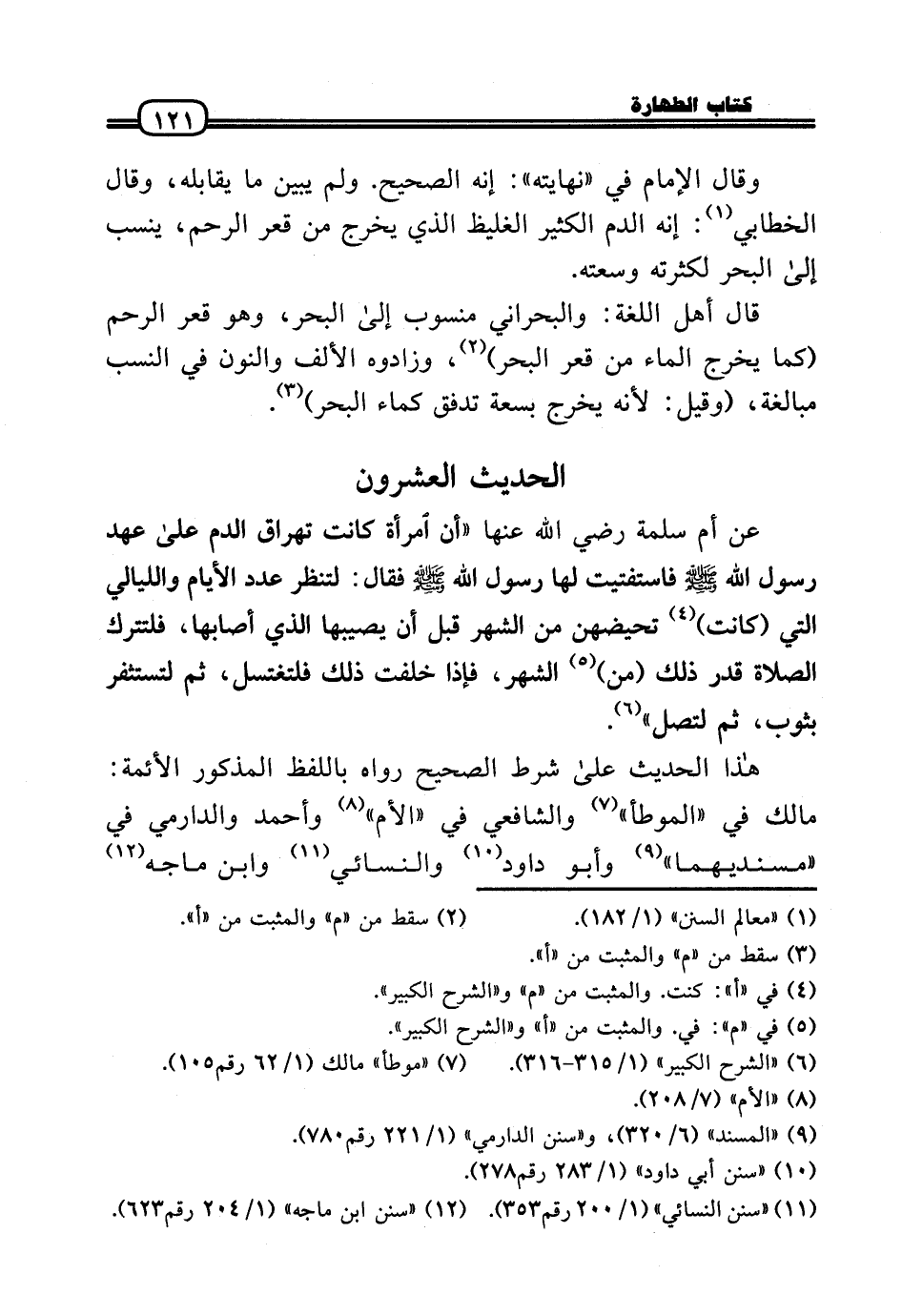 عَن أم سَلمَة رَضي اللهُ عَنها «أَن امْرَأَة كَانَت تهراق الدَّم عَلَى عهد رَسُول الله صَلَّى اللَّهُ عَلَيْهِ وَسَلَّم َ فاستفتيت لَهَا رَسُول الله صَلَّى اللَّهُ عَلَيْهِ وَسَلَّم َ فَقَالَ: لتنظر عدد الْأَيَّام والليالي الَّتِي (كَانَت) تحيضهن من الشَّهْر قبل أَن يُصِيبهَا الَّذِي أَصَابَهَا، فلتترك الصَّلَاة قدر ذَلِك (من) الشَّهْر، فَإِذا خلفت ذَلِك فلتغتسل، ثمَّ لتستثفر بِثَوْب، ثمَّ لتصل» .
