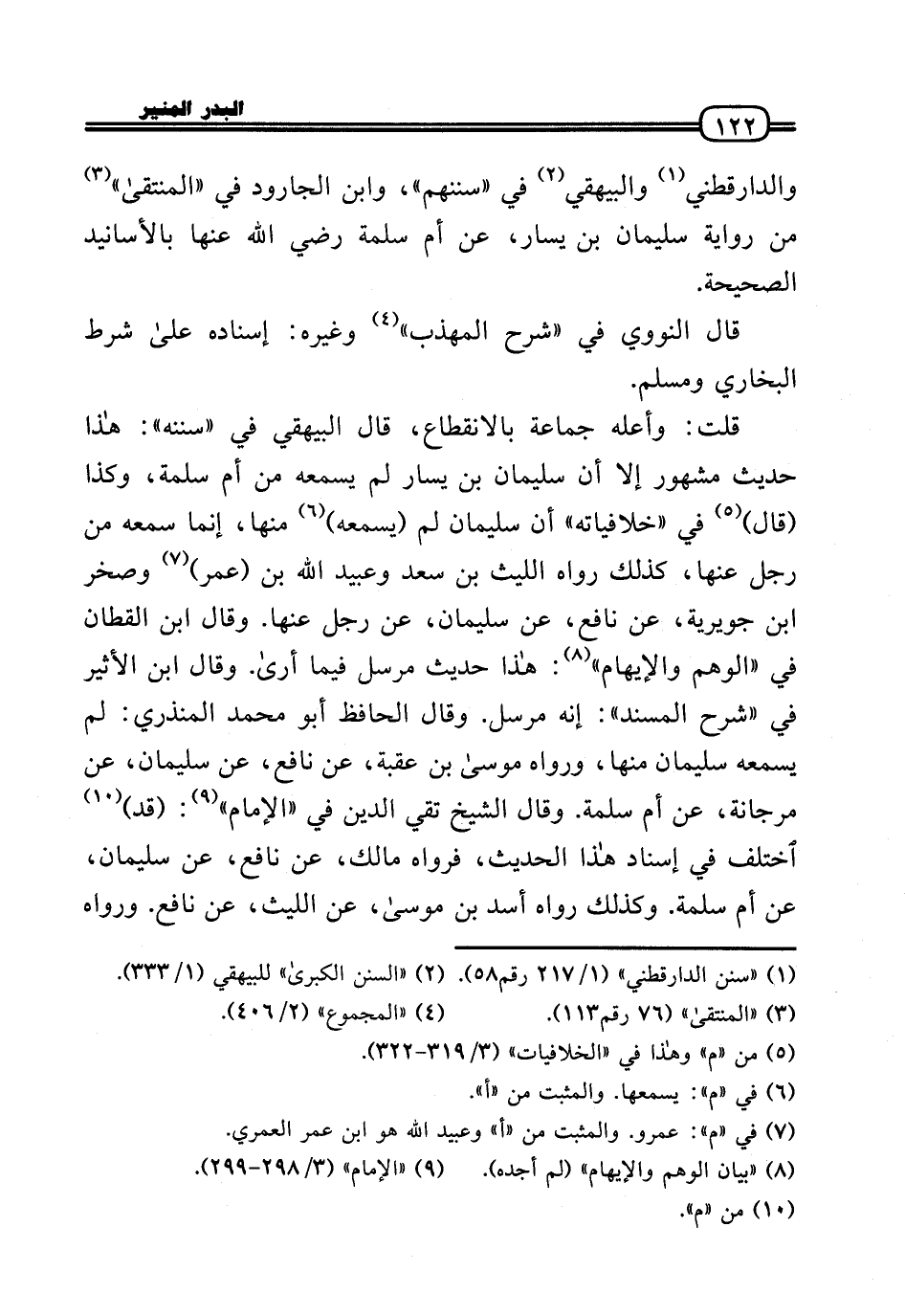 قلت: وَأعله جمَاعَة بالانقطاع، قَالَ الْبَيْهَقِيّ فِي «سنَنه» : هَذَا حَدِيث مَشْهُور إِلَّا أَن سُلَيْمَان بن يسَار لم يسمعهُ من أم سَلمَة، وَكَذَا (قَالَ) فِي «خلافياته» أَن سُلَيْمَان لم (يسمعهُ) مِنْهَا، إِنَّمَا سَمعه من رجل عَنْهَا، كَذَلِك رَوَاهُ اللَّيْث بن سعد وَعبيد الله بن (عمر) وصخر بن جوَيْرِية، عَن نَافِع، عَن سُلَيْمَان، عَن رجل عَنْهَا. وَقَالَ ابْن الْقطَّان فِي «الْوَهم وَالْإِيهَام» : هَذَا حَدِيث مُرْسل فِيمَا أرَى. وَقَالَ ابْن الْأَثِير فِي «شرح الْمسند» : إِنَّه مُرْسل. وَقَالَ الْحَافِظ أَبُو مُحَمَّد الْمُنْذِرِيّ: لم يسمعهُ سُلَيْمَان مِنْهَا، وَرَوَاهُ مُوسَى بن عقبَة، عَن نَافِع، عَن سُلَيْمَان، عَن مرْجَانَة، عَن أم سَلمَة. وَقَالَ الشَّيْخ تَقِيّ الدَّين فِي «الإِمَام» : (قد) اخْتلف فِي إِسْنَاد هَذَا الحَدِيث، فَرَوَاهُ مَالك، عَن نَافِع، عَن سُلَيْمَان، عَن أم سَلمَة. وَكَذَلِكَ رَوَاهُ أَسد بن مُوسَى، عَن اللَّيْث، عَن نَافِع. وَرَوَاهُ
