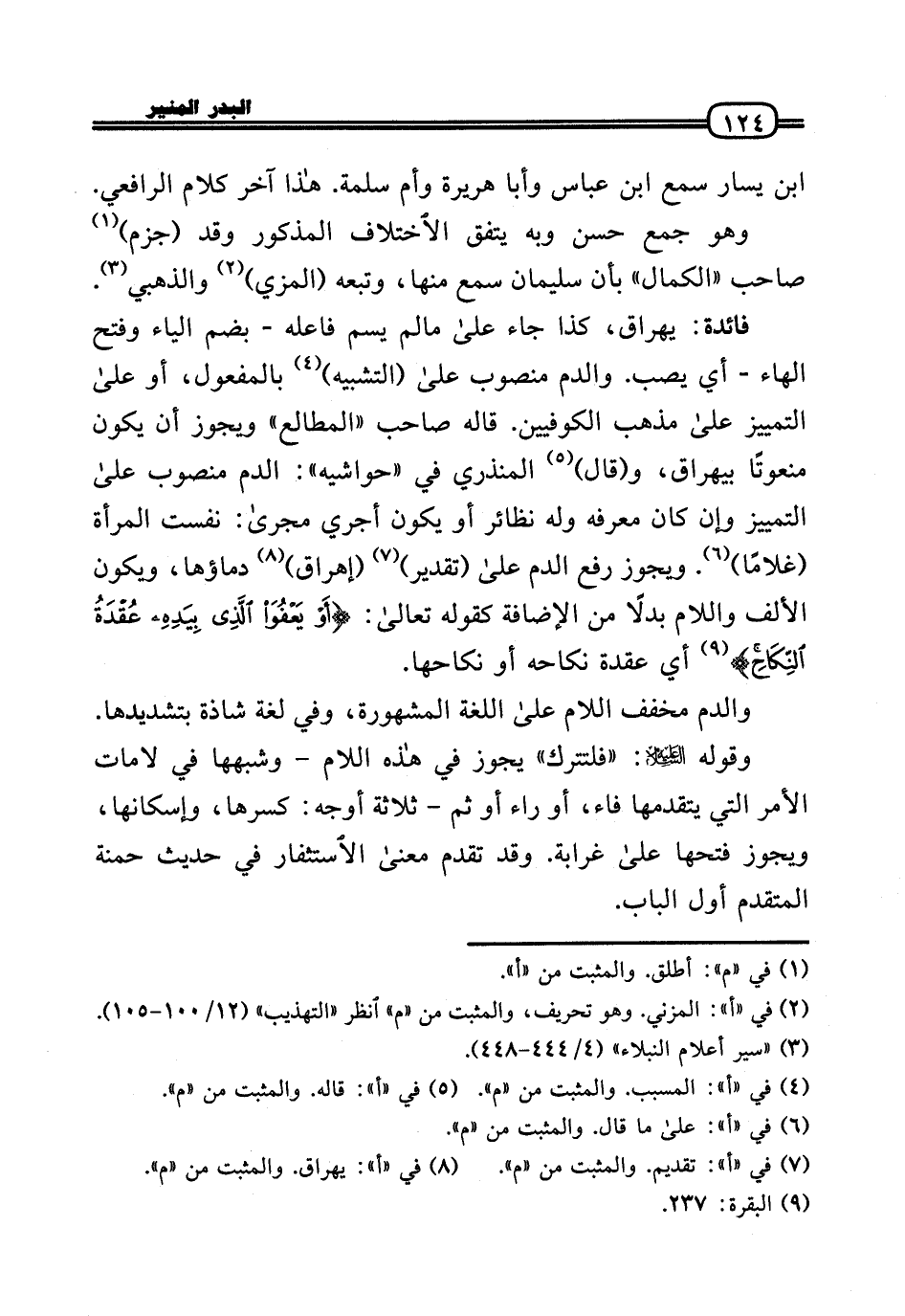 فَائِدَة: يهراق، كَذَا جَاءَ عَلَى مالم يسم فَاعله - بِضَم الْيَاء وَفتح الْهَاء - أَي يصب. وَالدَّم مَنْصُوب عَلَى (التَّشْبِيه) بالمفعول، أَو عَلَى التَّمْيِيز عَلَى مَذْهَب الْكُوفِيّين. قَالَه صَاحب «الْمطَالع» وَيجوز أَن يكون منعوتًا بيهراق، و (قَالَ) الْمُنْذِرِيّ فِي «حَوَاشِيه» : الدَّم مَنْصُوب عَلَى التَّمْيِيز وَإِن كَانَ معرفه وَله نَظَائِر أَو يكون أجري مجْرى: نفست الْمَرْأَة (غُلَاما) . وَيجوز رفع الدَّم عَلَى (تَقْدِير) (إهراق) دماؤها، وَيكون الْألف وَاللَّام بَدَلا من الْإِضَافَة كَقَوْلِه تَعَالَى: (أَو يعْفُو الَّذِي بِيَدِهِ عقدَة النِّكَاح) أَي عقدَة نِكَاحه أَو نِكَاحهَا.