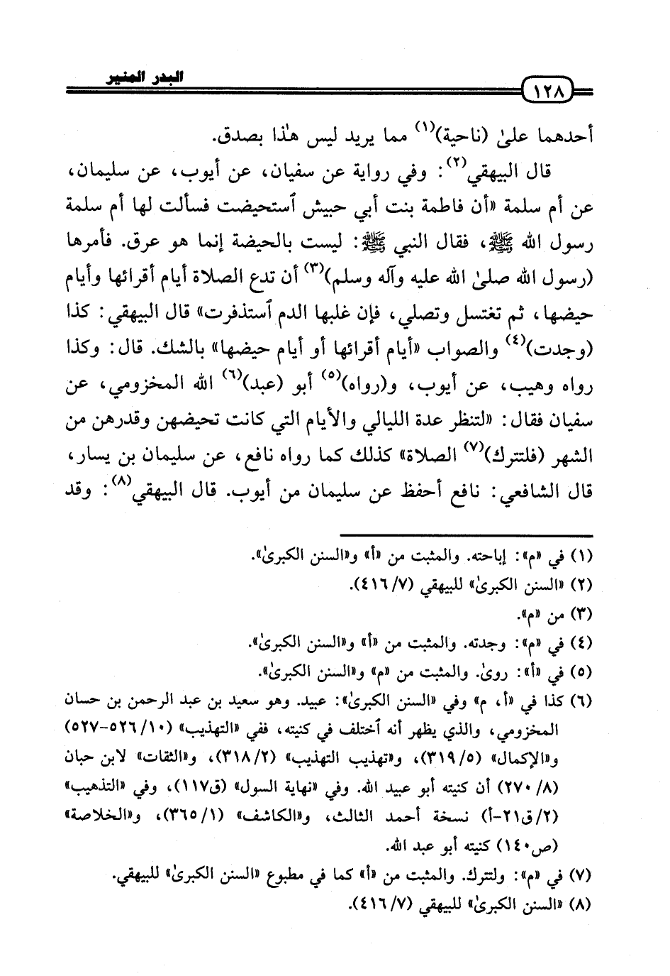 قَالَ الْبَيْهَقِيّ: وَفِي رِوَايَة عَن سُفْيَان، عَن أَيُّوب، عَن سُلَيْمَان، عَن أم سَلمَة «أَن فَاطِمَة بنت أبي حُبَيْش استحيضت فَسَأَلت لَهَا أم سَلمَة رَسُول الله صَلَّى اللَّهُ عَلَيْهِ وَسَلَّم َ، فَقَالَ النَّبِي صَلَّى اللَّهُ عَلَيْهِ وَسَلَّم َ: لَيست بالحيضة إِنَّمَا هُوَ عرق. فَأمرهَا (رَسُول الله صَلَّى الله عَلَيْهِ وَآله وَسلم) أَن تدع الصَّلَاة أَيَّام أقرائها وَأَيَّام حَيْضهَا، ثمَّ تَغْتَسِل وَتصلي، فَإِن غلبها الدَّم استذفرت» قَالَ الْبَيْهَقِيّ: كَذَا (وجدت) وَالصَّوَاب «أَيَّام أقرائها أَو أَيَّام حَيْضهَا» بِالشَّكِّ. قَالَ: وَكَذَا رَوَاهُ وهيب، عَن أَيُّوب، و (رَوَاهُ) أَبُو (عبد) الله المَخْزُومِي، عَن سُفْيَان فَقَالَ: «لتنظر عدَّة اللَّيَالِي وَالْأَيَّام الَّتِي كَانَت تحيضهن وقدرهن من الشَّهْر (فلتترك) الصَّلَاة» كَذَلِك كَمَا رَوَاهُ نَافِع، عَن سُلَيْمَان بن يسَار، قَالَ الشَّافِعِي: نَافِع أحفظ عَن سُلَيْمَان من أَيُّوب. قَالَ الْبَيْهَقِيّ: وَقد