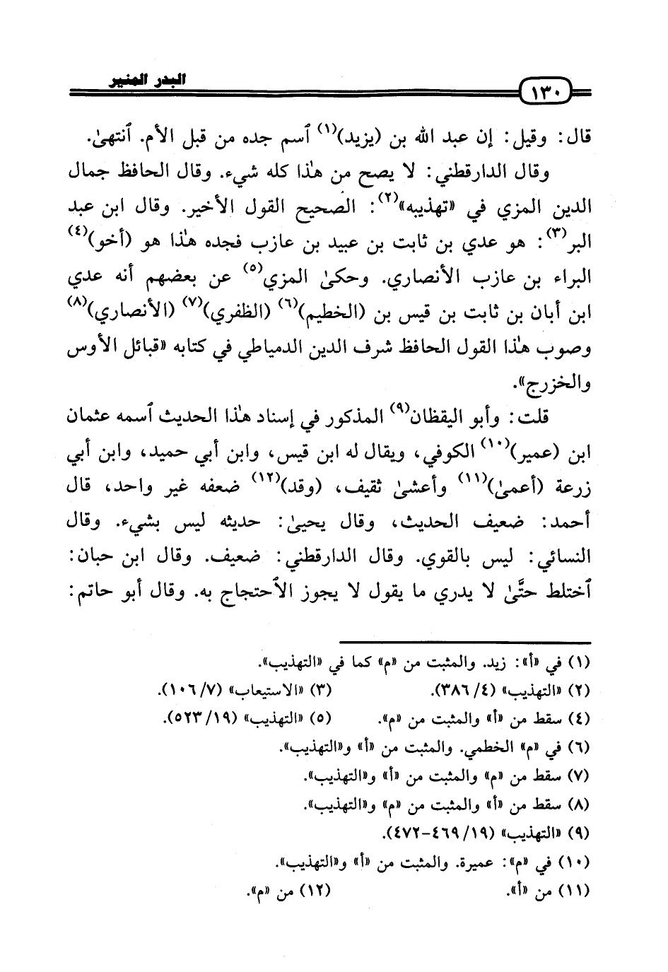 قلت: وَأَبُو الْيَقظَان الْمَذْكُور فِي إِسْنَاد هَذَا الحَدِيث اسْمه عُثْمَان بن (عُمَيْر) الْكُوفِي، وَيُقَال لَهُ ابْن قيس، وَابْن أبي حميد، وَابْن أبي زرْعَة (أَعْمَى) وأعشى ثَقِيف، (وَقد) ضعفه غير وَاحِد، قَالَ أَحْمد: ضَعِيف الحَدِيث، وَقَالَ يَحْيَى: حَدِيثه لَيْسَ بِشَيْء. وَقَالَ النَّسَائِيّ: لَيْسَ بِالْقَوِيّ. وَقَالَ الدَّارَقُطْنِيّ: ضَعِيف. وَقَالَ ابْن حبَان: اخْتَلَط حتَّى لَا يدْرِي مَا يَقُول لَا يجوز الِاحْتِجَاج بِهِ. وَقَالَ أَبُو حَاتِم: