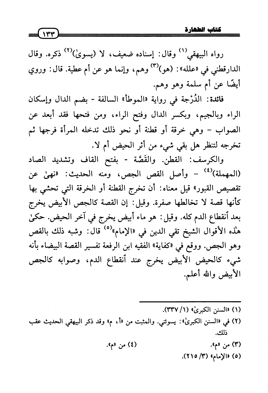 والكرسف: الْقطن. والقَصَّة - بِفَتْح الْقَاف وَتَشْديد الصَّاد (الْمُهْملَة) - وأصل القص الجص، وَمِنْه الحَدِيث: «نهَى عَن تقصيص الْقُبُور» قيل مَعْنَاهُ: أَن تخرج القطنة أَو الْخِرْقَة الَّتِي تحشي بهَا كَأَنَّهَا قصَّة لَا تخالطها صفرَة. وَقيل: إِن الْقِصَّة كالجص الْأَبْيَض يخرج بعد انْقِطَاع الدَّم كُله. وَقيل: هُوَ مَاء أَبيض يخرج فِي آخر الْحيض. حَكَى هَذِه الْأَقْوَال الشَّيْخ تَقِيّ الدَّين فِي «الإِمَام» قَالَ: وَشبه ذَلِك بالقص وَهُوَ الجص. وَوَقع فِي «كِفَايَة» الْفَقِيه ابْن الرّفْعَة تَفْسِير الْقِصَّة الْبَيْضَاء بِأَنَّهُ شَيْء كالحيض الْأَبْيَض يخرج عِنْد انْقِطَاع الدَّم، وَصَوَابه كالجص الْأَبْيَض وَالله أعلم.