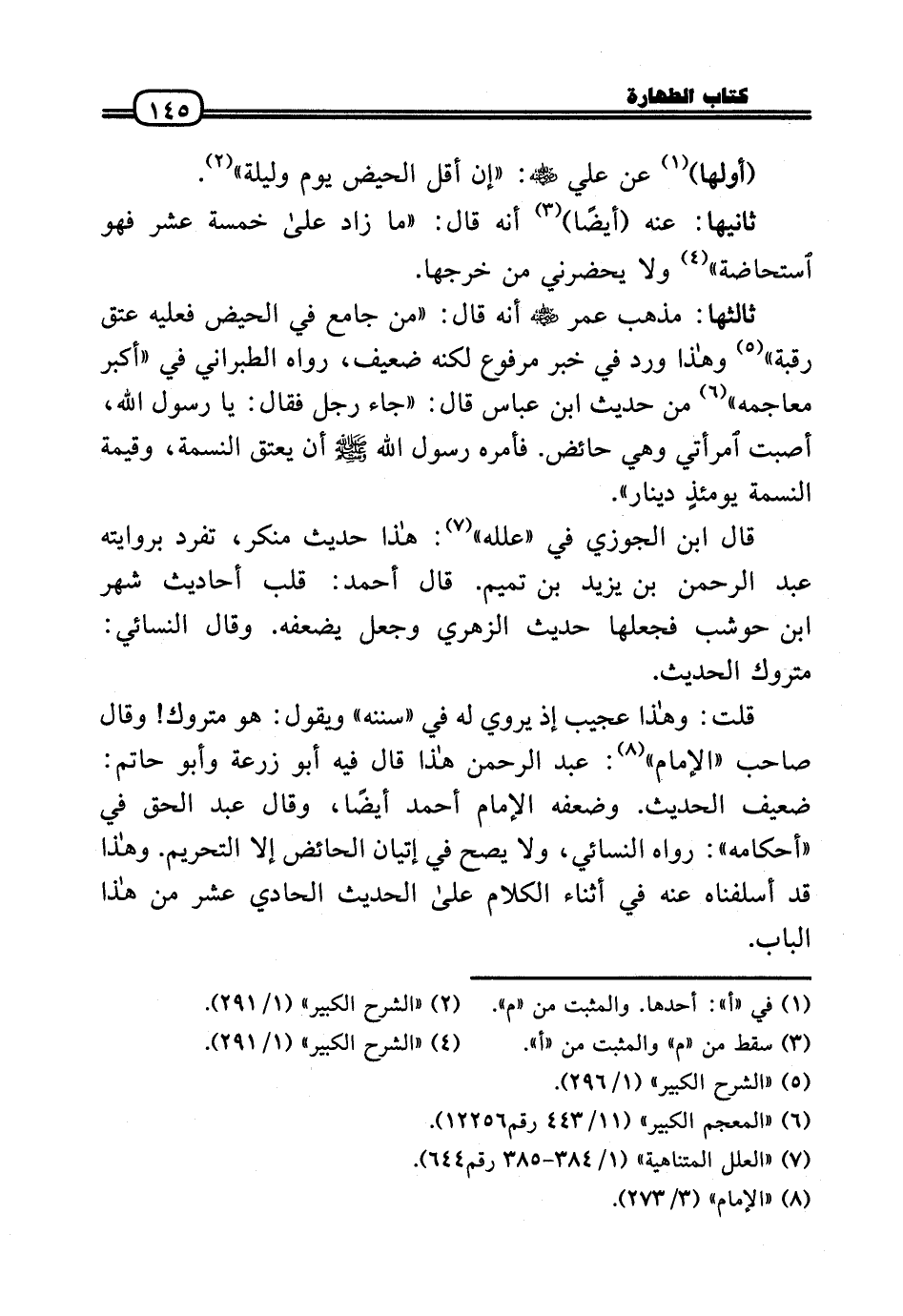 قلت: وَهَذَا عَجِيب إِذْ يروي لَهُ فِي «سنَنه» وَيَقُول: هُوَ مَتْرُوك! وَقَالَ صَاحب «الإِمَام» : عبد الرَّحْمَن هَذَا قَالَ فِيهِ أَبُو زرْعَة وَأَبُو حَاتِم: ضَعِيف الحَدِيث. وَضَعفه الإِمَام أَحْمد أَيْضا، وَقَالَ عبد الْحق فِي «أَحْكَامه» : رَوَاهُ النَّسَائِيّ، وَلَا يَصح فِي إتْيَان الْحَائِض إِلَّا التَّحْرِيم. وَهَذَا قد أسلفناه عَنهُ فِي أثْنَاء الْكَلَام عَلَى الحَدِيث الْحَادِي عشر من هَذَا الْبَاب.